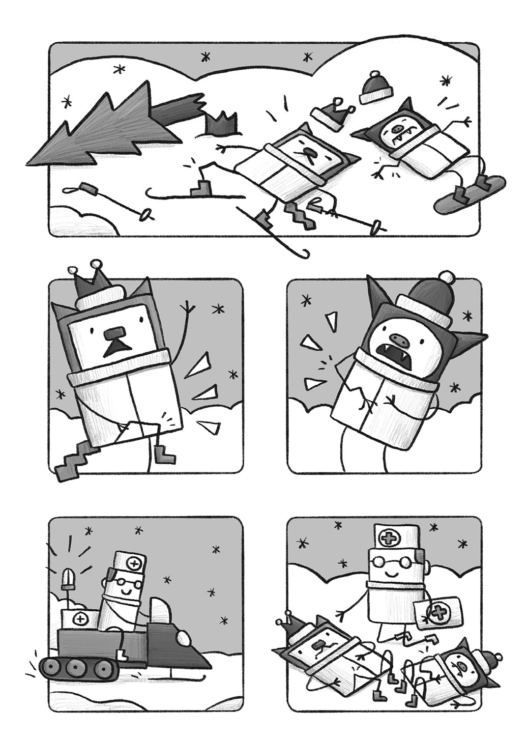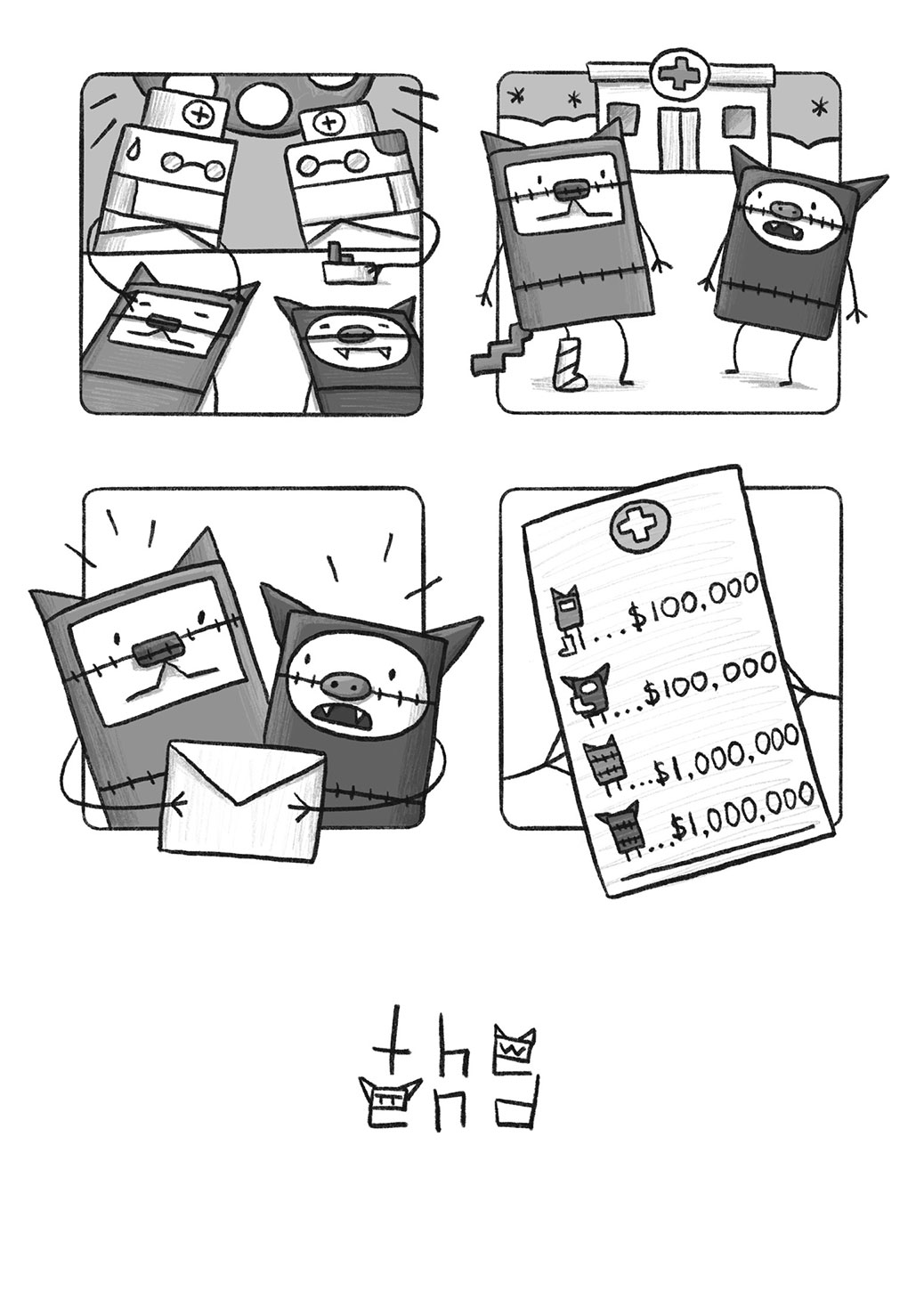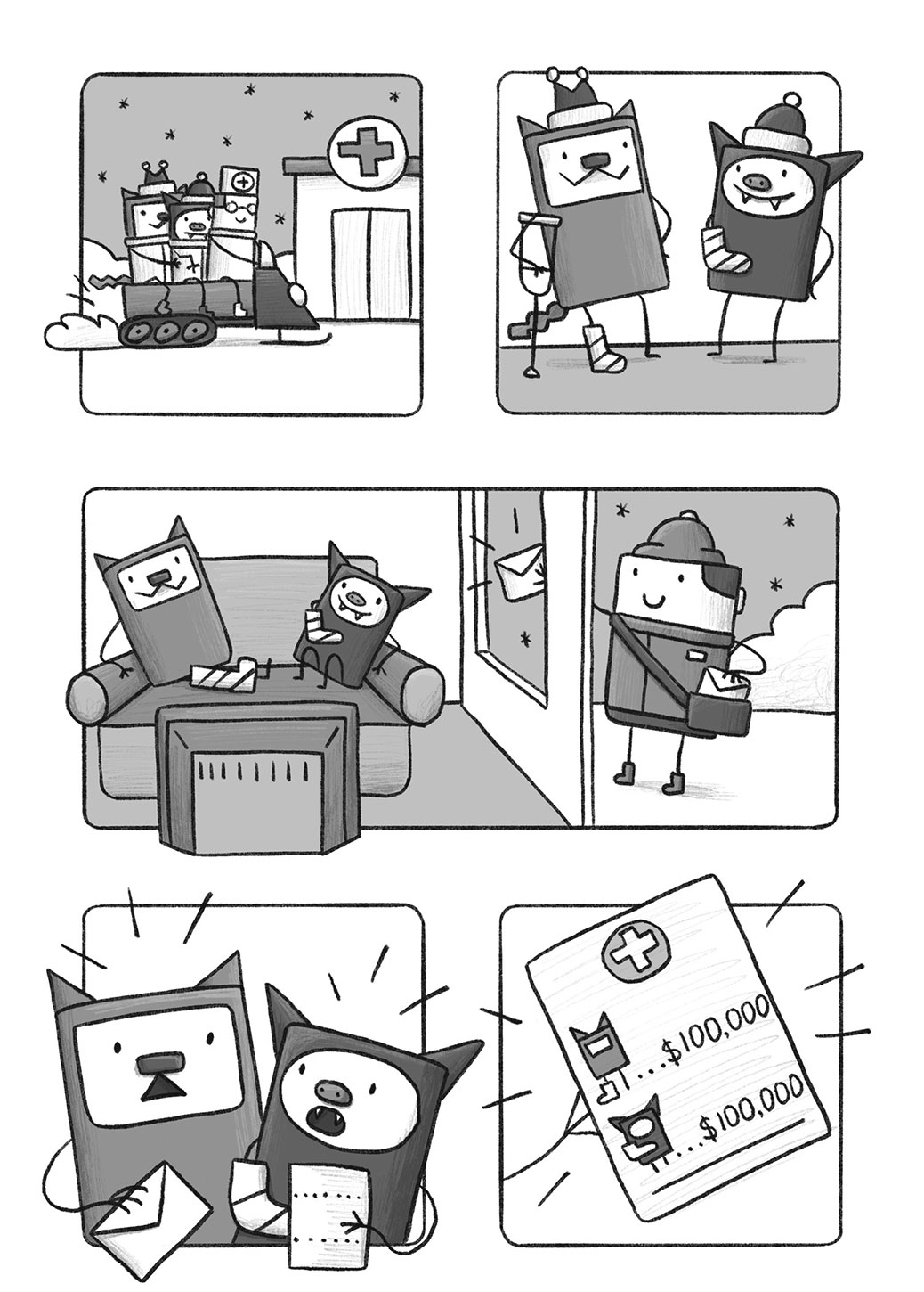 Cat'N'Bat marks the graphic novel debut for Sashko Danylenko, an animator and artist originally from Ukraine. While some authors go all-in on plots, Danylenko's stories are simple, six-page tales about a pair of mischievous, box-shaped friends (a cat and a bat) that go on ill-fated adventures.