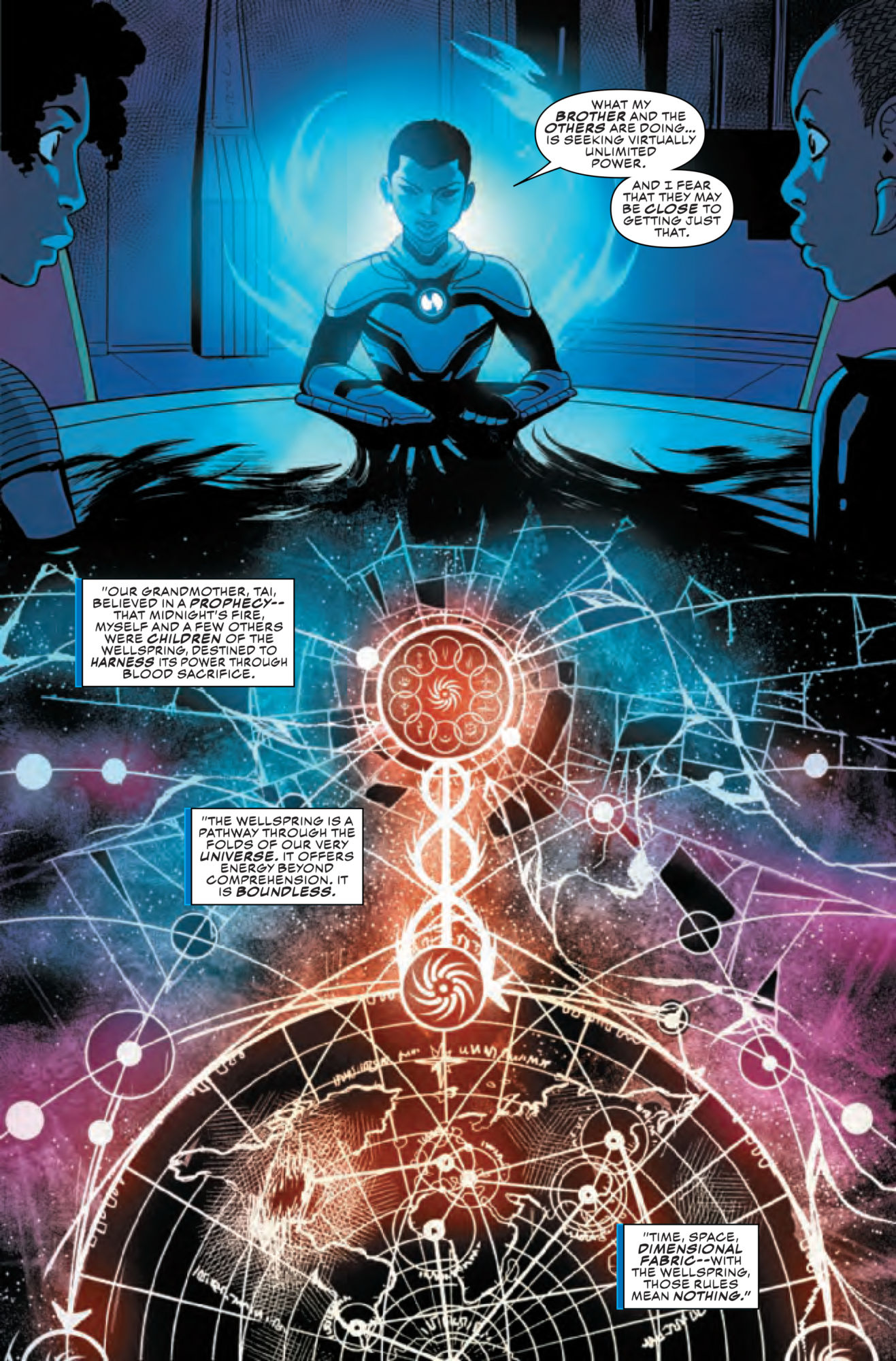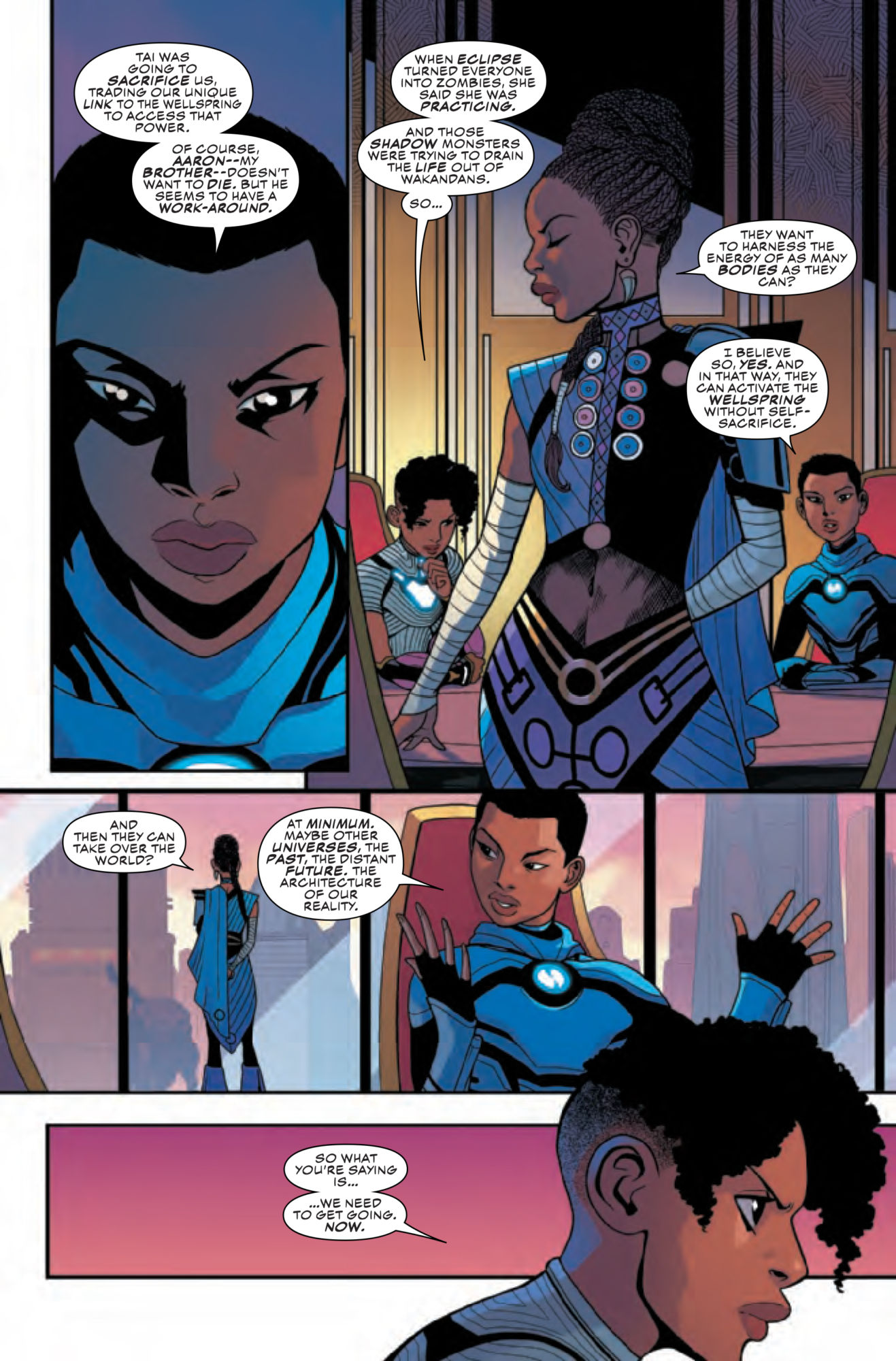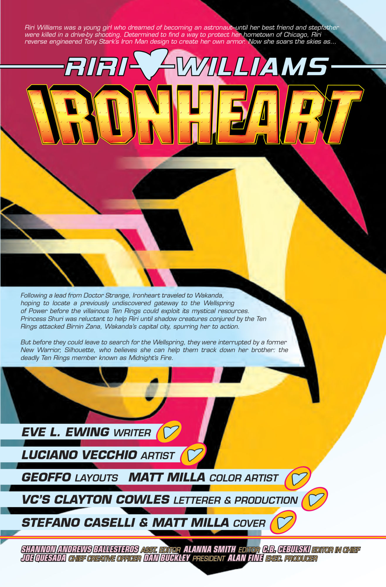 The Iconic Ironheart and her new squad continue their trek in search of the Wellspring of Power, hidden somewhere in uncharted Wakandan territory. But Riri's in for a surprise when she meets her match…literally!