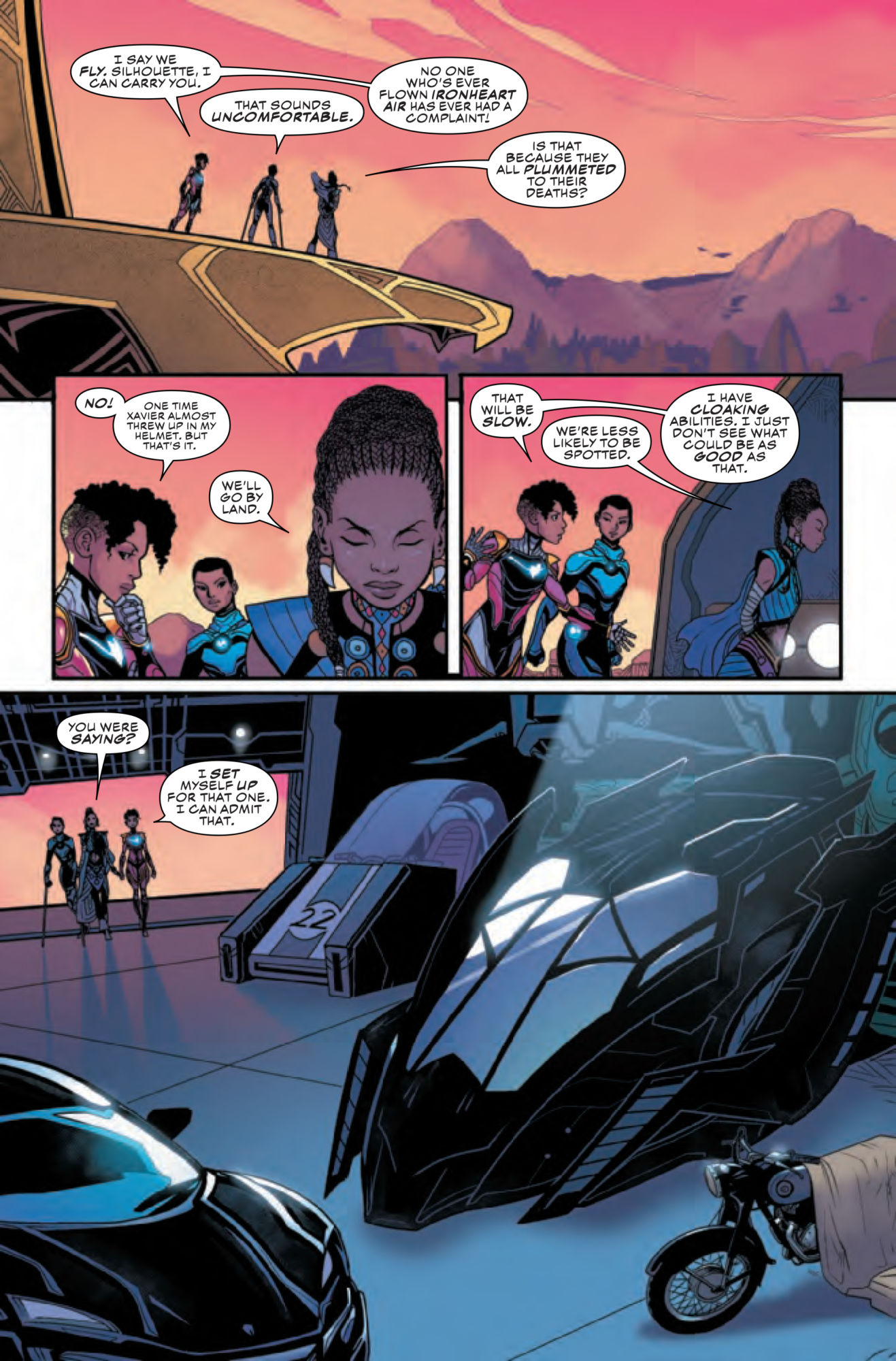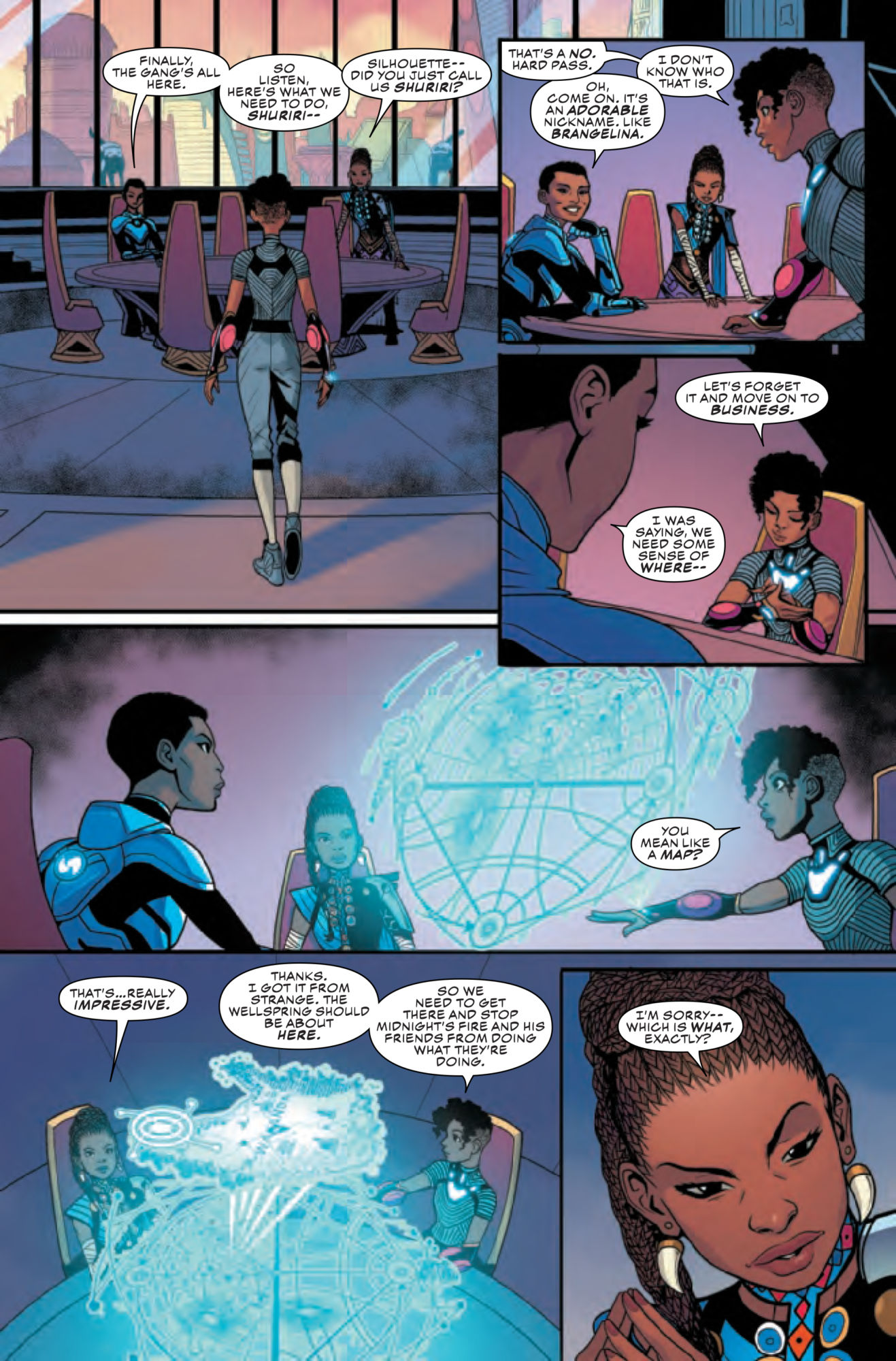 As the recap page tells us, in pursuit of the mystery behind the Ten Rings, Ironheart has traveled to Wakanda for a team-up with Shuri and former New Warrior Silhouette.