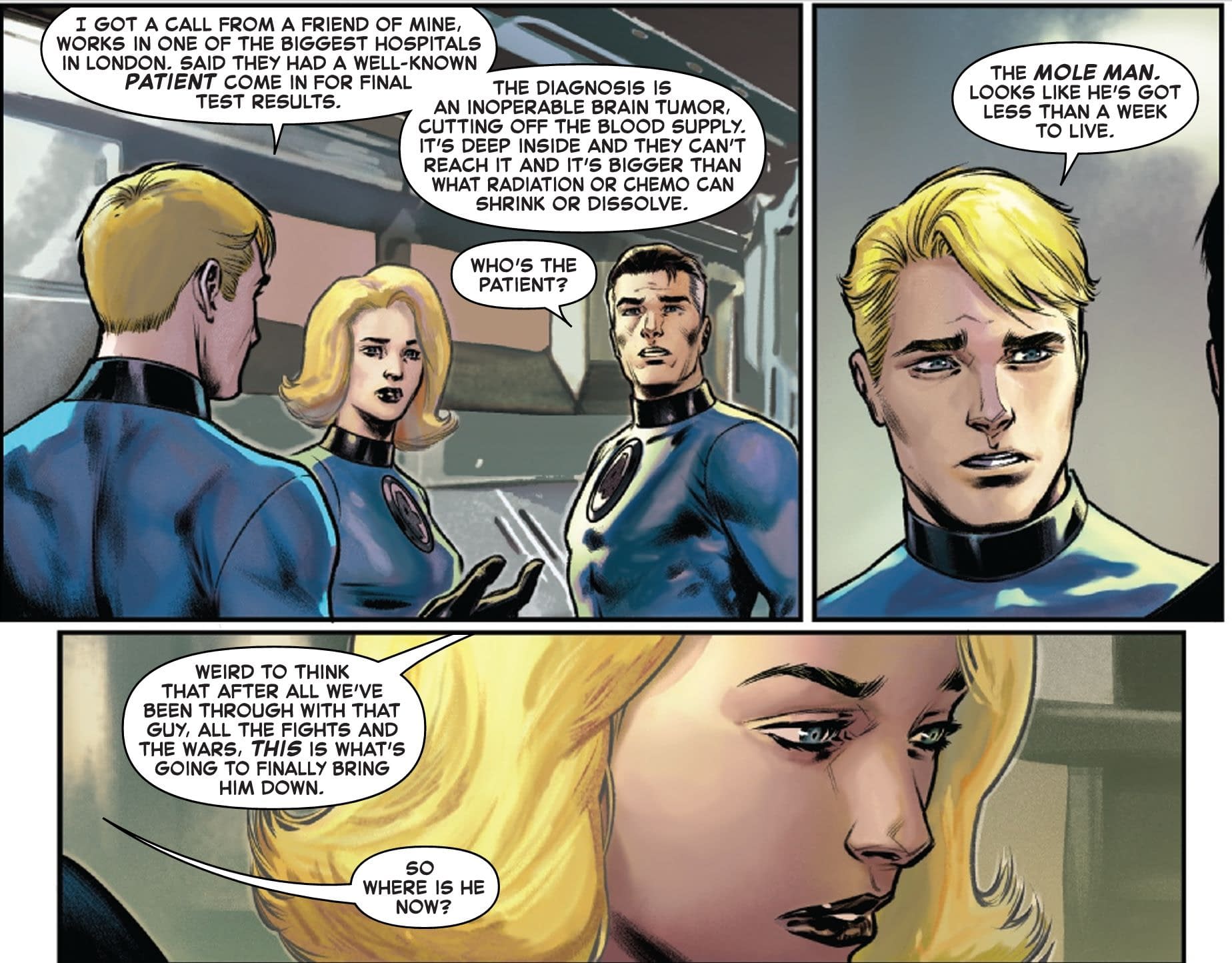 With the word that the Mole Man is dying from cancer, a brain tumour. And in the context of the recent film, a more sympathetic Mole Man… and a visit from Sue…
