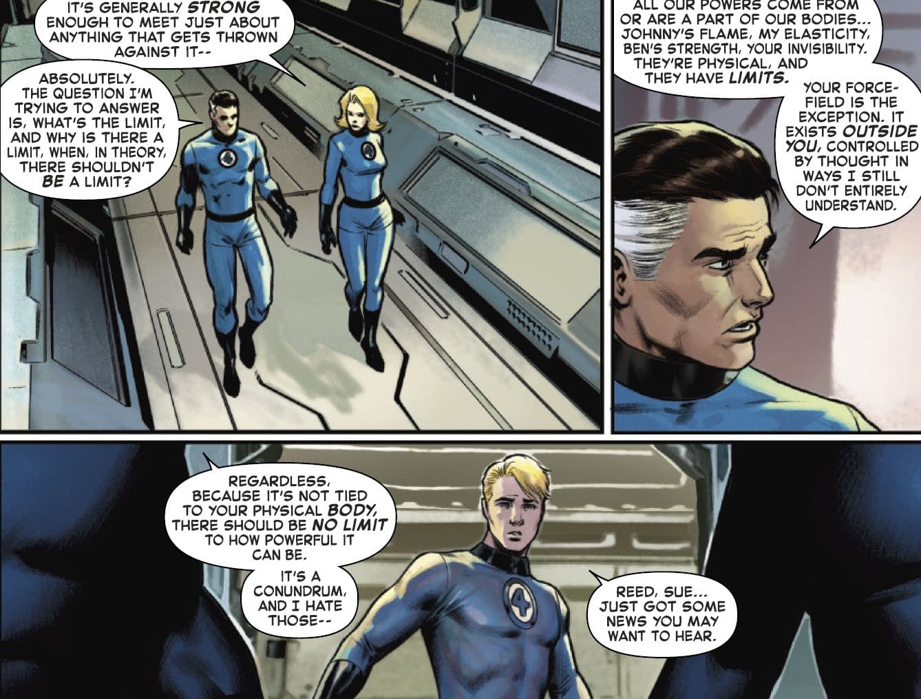 With Reed Richards asking Susan Storm about whether or not her force field generation powers have any limits, and if so, why? The question may be meant in a physical fashion, but means more in the context of the story.