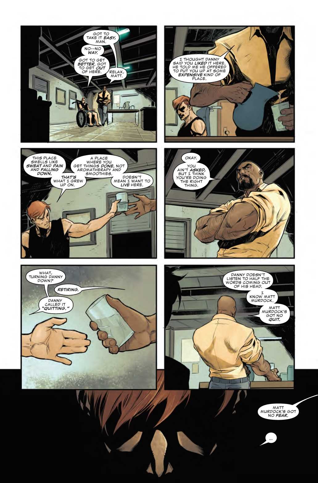 That Netflix cancellation really messed ol' Daredevil up. Matt Murdock is a broken man, both physically and emotionally, and he no longer wants to be Daredevil. Even still, he does hope to get back on his feet, so he's been training and recovering, but his good friend Iron Fist doesn't feel that Matt is getting the best medical rehab treatment available…