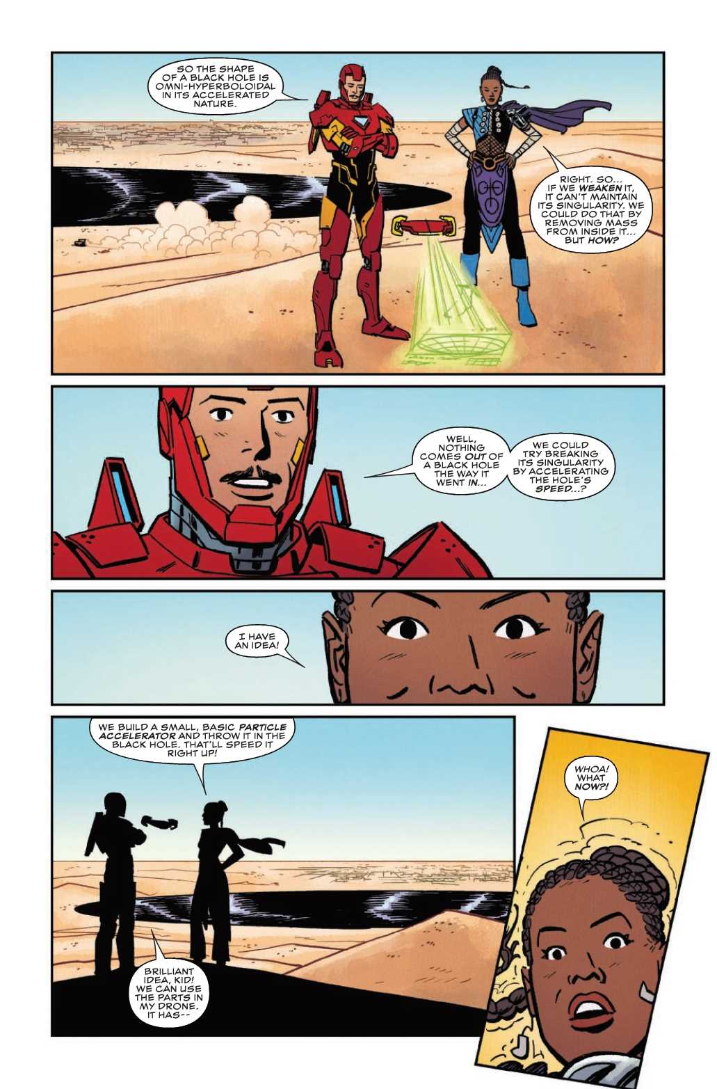 And it isn't just Tony's own ideas that go bad whenever he's around. During Civil War, he and Reed Richards teamed up to make an evil, murderous clone of Thor. And in this preview of next week's Shuri #5, even the titular Shuri is not immune to Stark's bad influence. Because as a small but growing black hole threatens to destroy Timbuktu, Shuri has the bright idea to… toss a particle accelerator into it?!