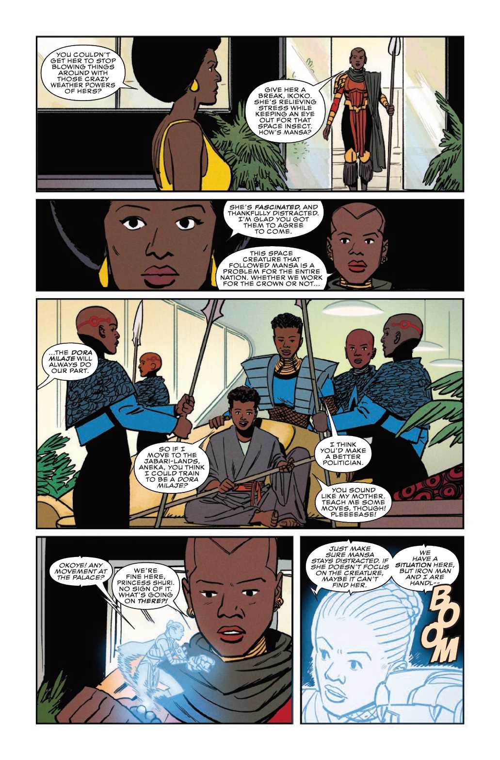 An alien creature has invaded Wakanda! And with her powers strangely malfunctioning and her brother still missing, Shuri is in over her head. Time to call for backup. Enter: Iron Man! But can these two tech geniuses figure out how to de-power an energy-sucking alien before it destroys the entire continent? Don't miss the end of the first arc – and a dramatic change for the princess of Wakanda!