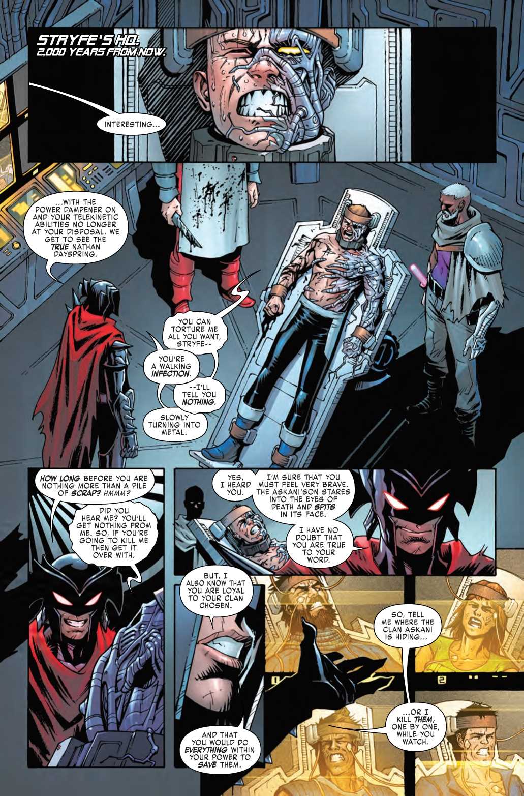 The latest X-Force series has been making some changes to Cable's alternate future history, and the most recent issue saw Cable kidnapped by Stryfe's Mutant Liberation Army and taken to the future, where he's considered a terrorist. Why? This preview of X-Force #7 may shed some light on the matter.