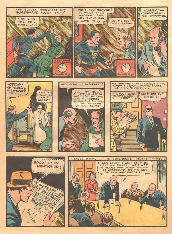 And also referencing Action Comics #1, in which Superman is on a mission to save someone from the electric chair, and who is due to die at midnight, unless he can reach the Governor with the evidence…