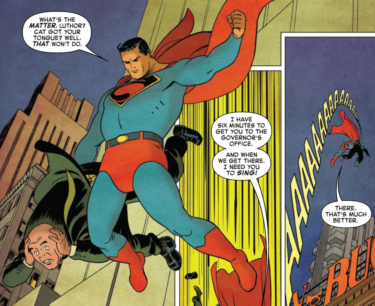 But we also get an Amazing Fantasy #15 reference from Spider-Man's first appearance as Superman races, jumping over tall buildings, to reach the Governor…