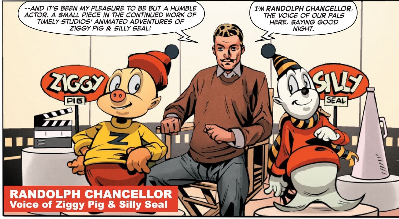 As the voice of classic Marvel kids comics from the fifties, when they used to be known as Timely, but also sounding a lot like Trevor Slattery. Just with a wig and a moustache.