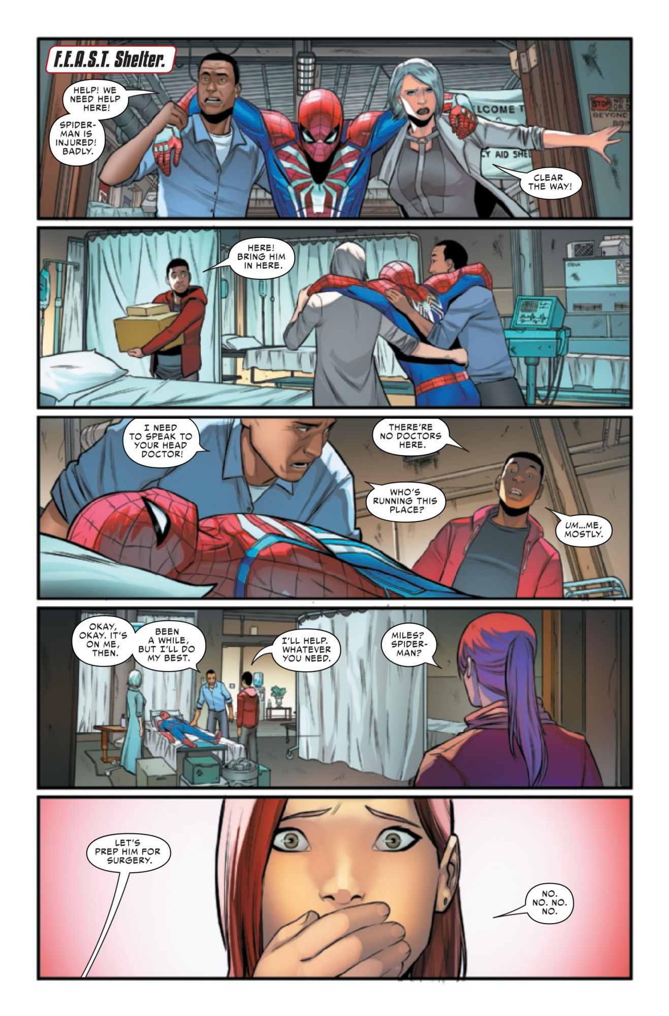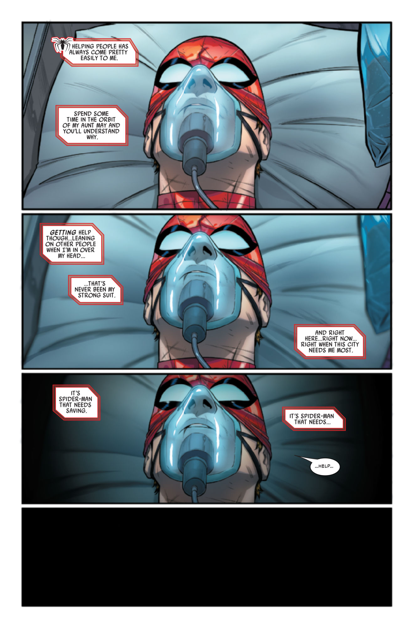 Meanwhile, Spidey gets treatment for his injuries fighting Doctor Octopus, as this makeshift hospital has some pretty lax guidelines on allowing you to wear a mask while receiving treatment. What would the insurance company say about that?