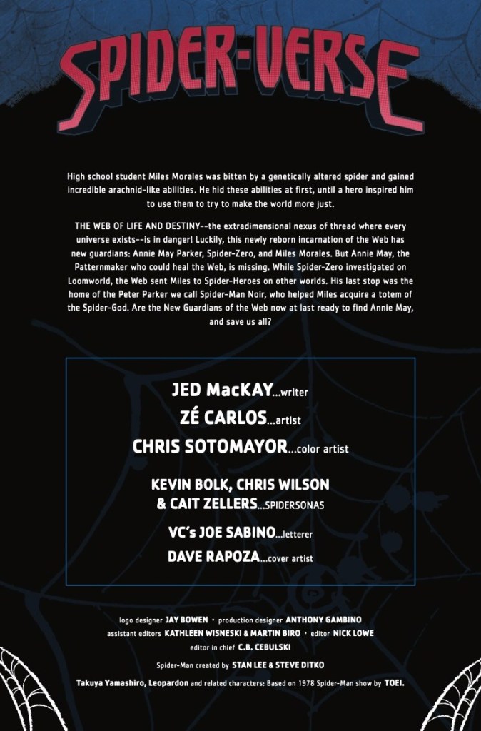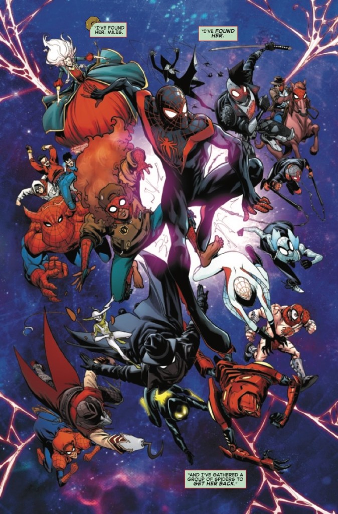 • All the various threads of this series (Miles Morales, Spider-Man Noir, SP//dr, Webslinger, Spider-Ma'am, and all the other Spider-People and Spider-Sonas) come together to re-spin the Web of Life and Destiny!