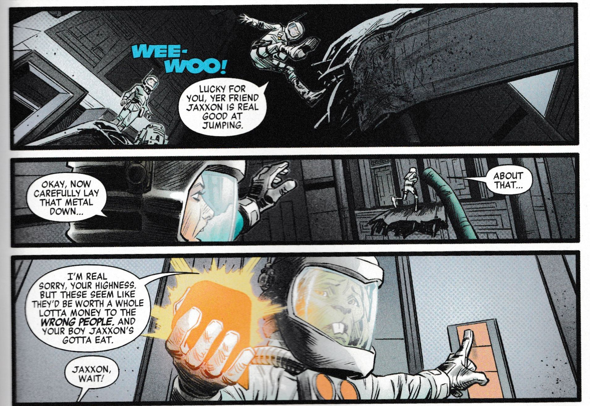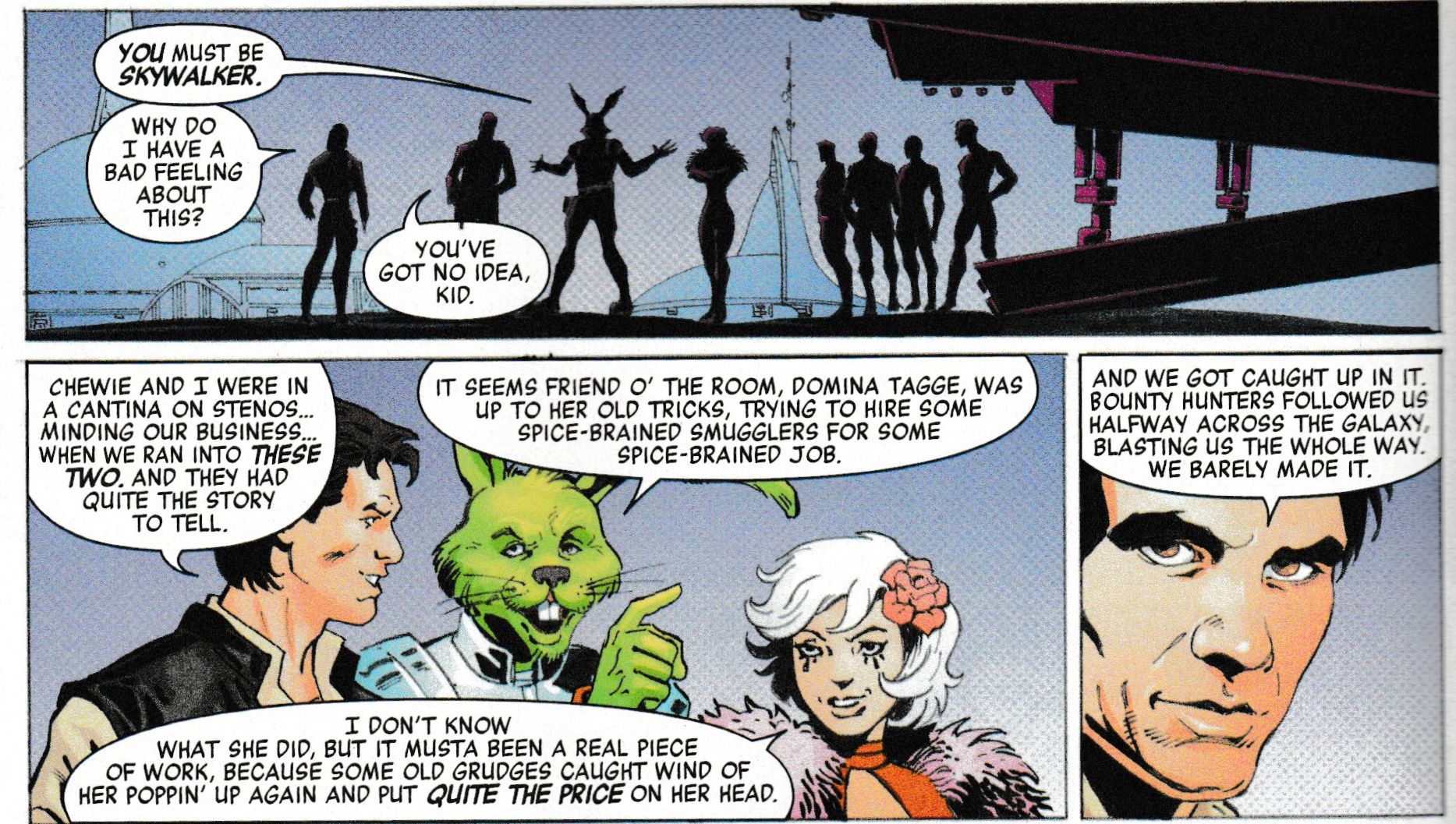 Until he's caught by the hunter. And told how awful he is as well. Again. So, for Jaxxon fans, at least you get him back tomorrow in the original Marvel Star Wars continuity. But there's going to be a lot of dissing…