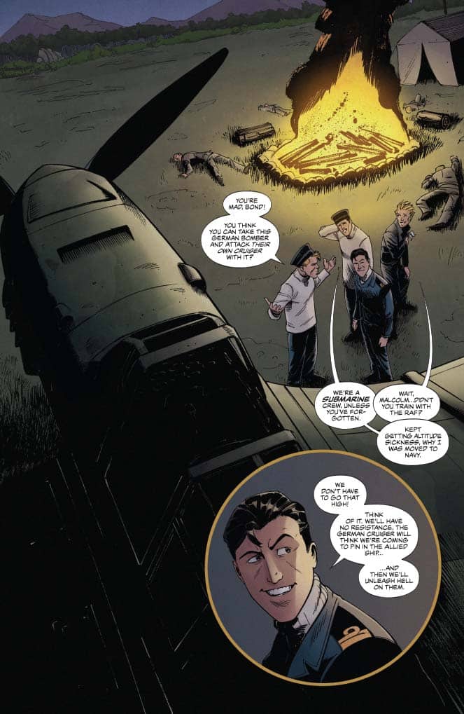 We take a minute to examine what they have to work with and learn a bit about Der Stuka (German for THE SHARK) bombers. To me, this is the kind of stuff that best fits our early days/more grounded version of Bond. We're not breaking out all kinds of gadgets, we're showing the ingenuity of what they really had to work with at the time. Note the Nazi makes fun of them, which probably pushes the young men off the fence about whether they'll give James' plan a go.