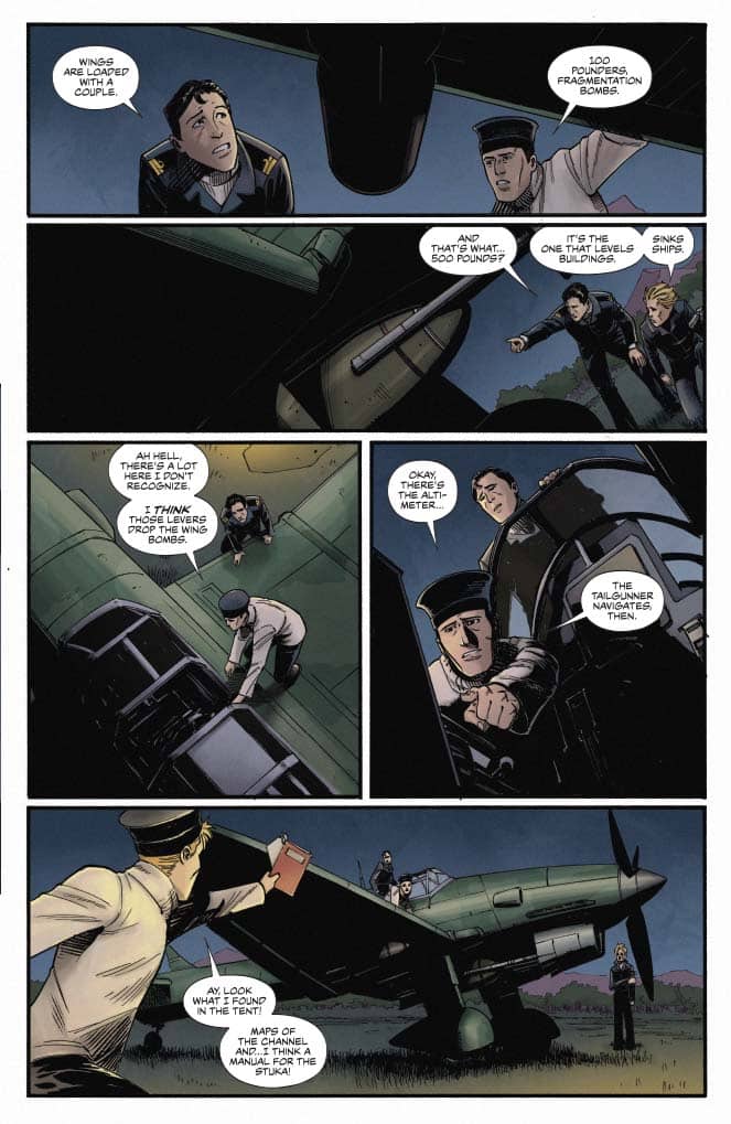 The big splash page of the Stuka dive. By the way, the Stukas were known for having this terrifying siren that you would hear as they went into their dive. The Nazis clearly liked the psychological terror of having a sound associated with unleashing hell. But, we established earlier that they removed the one from this plane because it was used for sneak attacks in this channel.