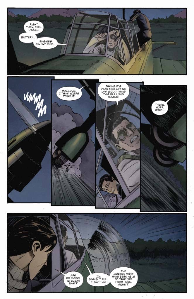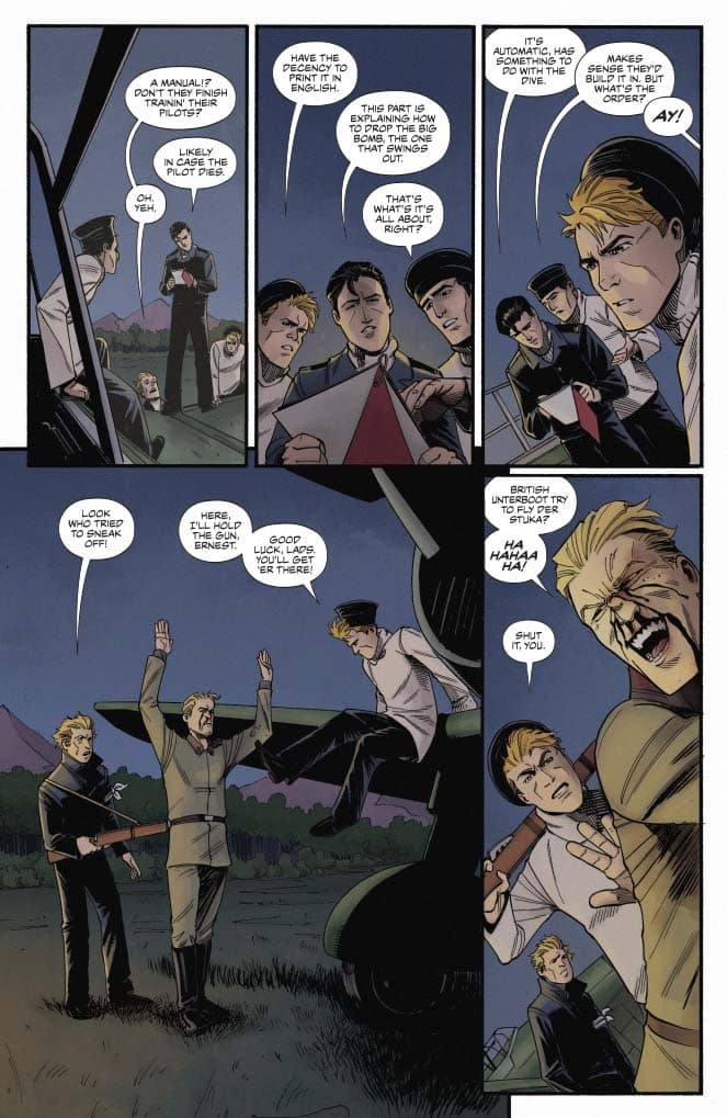 I love the idea of Bond fumbling with a manual and trying to remember as much German as possible to understand how the bombing sequence works. This kind of stuff makes me attach to the characters way more than heroes who slickly pull off something they've never done before. And look at that bottom panel where Bob puts the camera way up in the sky to get them starting to dive–that's the stuff right there.