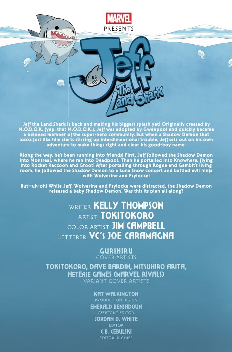 - Cover image for 75960621313900421 JEFF THE LAND SHARK #4 TOKITOKORO VARIANT, by Kelly Thompson & Tokitokoro, in stores Wednesday, September 24, 2025 from Marvel