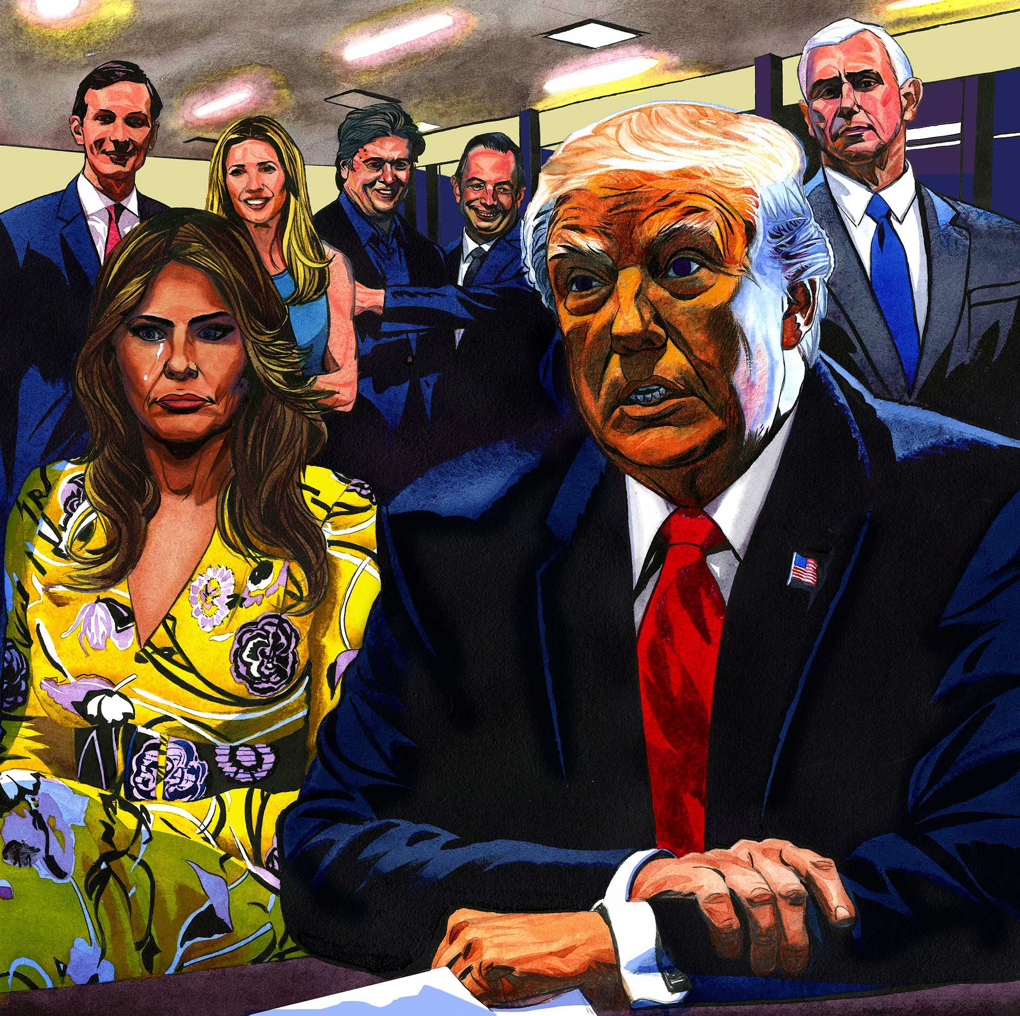 6) I finished the opener (Trump and company watching election results) and the bedroom scene on January 2 and sent artwork / digital files in the middle of the night. It was at that time that the magazine decided to put the story and the 2 images online early. They never had to say anything to me because I had already sent the art.