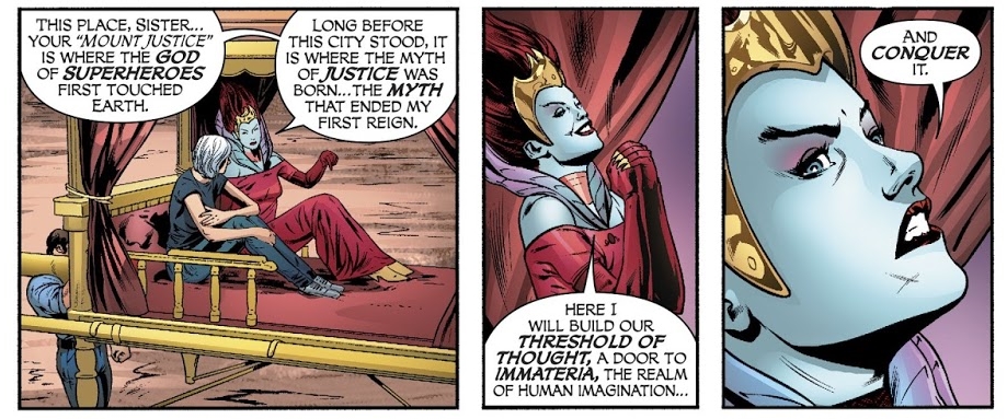In previous comics, we had already seen the Justice League Of America character Killer Frost linked to Destiny of The Endless, from Neil Gaiman's Sandman. Now she is linked to the Queen of Fables, a Mark Waid/Bryan Hitch character from earlier JLA comics. And, revealed in last week's Justice League Of America #22, longing for Immateria, the realm of imagination created in Promethea, trying to invade the DC universe.