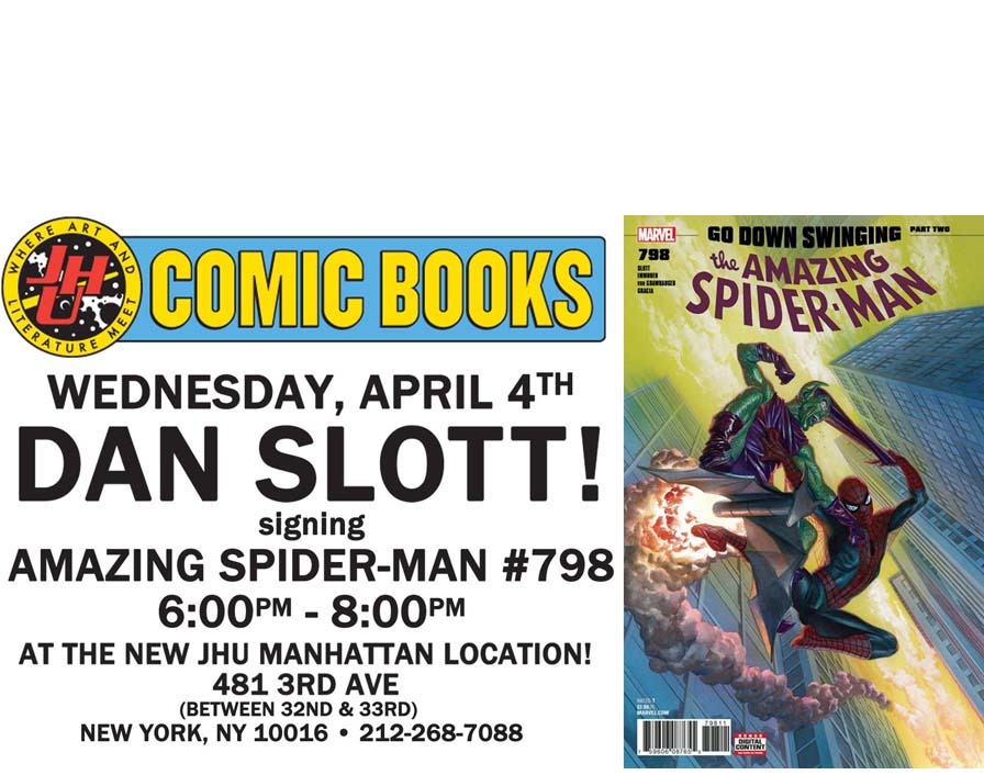 Because, yes, Dan Slott will be at the new location on Wednesday to sign Amazing Spider-Man #798s (if you can get one) in the wake of the news that he will be launching Fantastic Four #1. Maybe he can tell you how Ike Perlmutter was talked round…