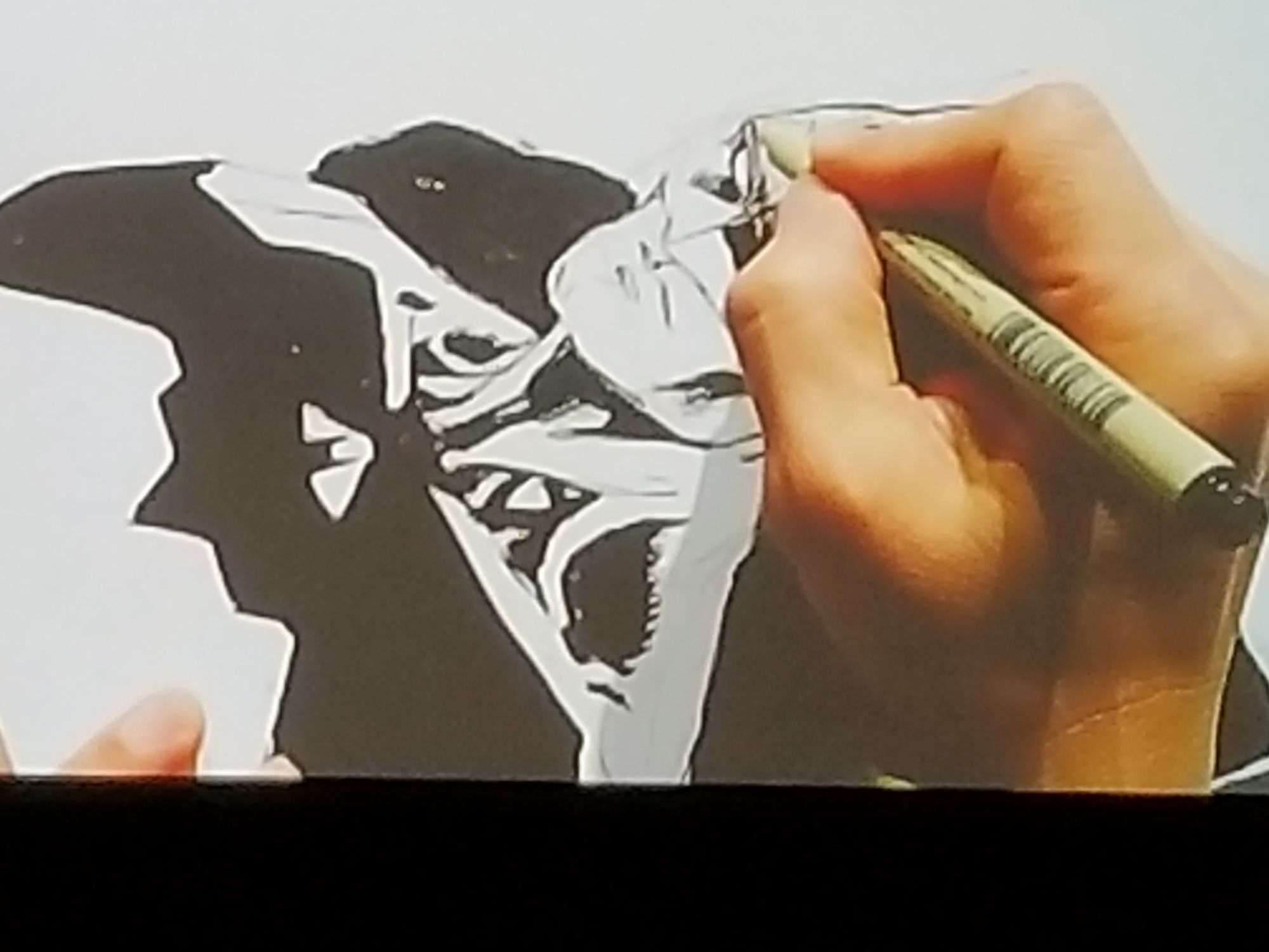 The first person up to the mike, "Chain", doesn't have a question, but, as a way of thanks for signing his issue of Batman: Hush last year, he presents the gift of a caricature that he had drawn of Lee. The very next fan is tired of his buddy "Chain" bragging about how he got Hush signed by Jim Lee last year, and asked if Lee would sign his twice to shut him up. Of course, the gracious Lee complies and adds a sketch.