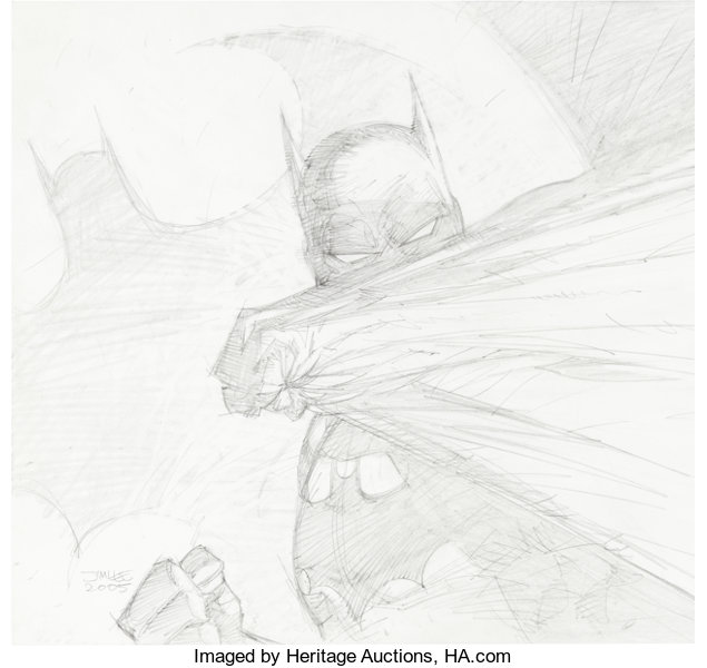 Jim Lee Batman:Hush Absolute Edition Endpaper Illustration Original Art (DC Comics, 2005). The year long saga "Hush" dealt with Batman's friendships, trust, and betrayal that pitted him against the deadliest members of his Rogue's Gallery and introduced his newest foe! This original pencil sketch is from the Jim Lee sketchbook that was included in the Absolute Edition, as noted by Lee himself on the en verso of the page. Created in graphite on Bristol board with an image area of 17" x 11". Light handling wear and signed by Lee in the lower left. In Excellent condition. Current bid: $2069.