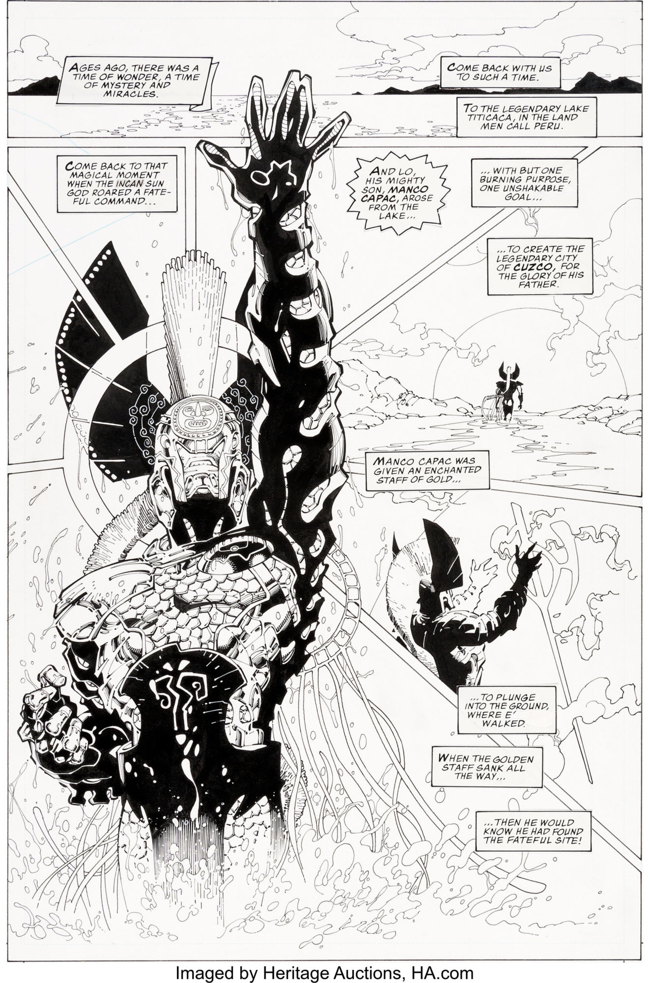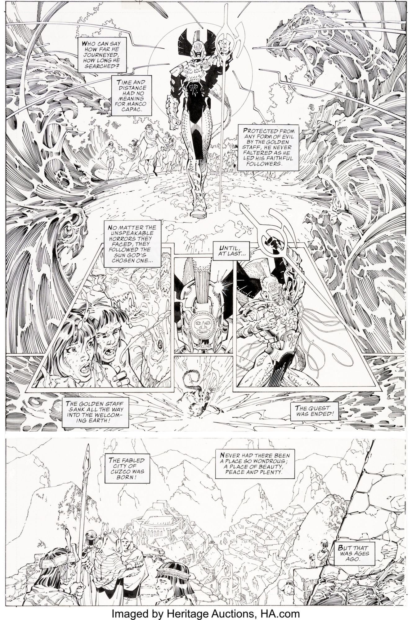 Jim Lee and Scott Williams Just Imagine Stan Lee with Jim Lee Creating Wonder Woman #nn Story Page 2 Original Art (DC, 2001). Manco Capac marches into what is now Peru and creates the city of Cusco. And that's just on Page 2 of this "Tale of Two Lees". Rendered in high detail in ink over graphite on bright white DC Bristol board with an image area of 10.5" x 16". Signed in the lower margin by Jim Lee. All text is stat paste-up. In Excellent condition. Current bid: $370.