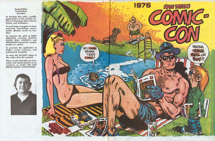 This also marks the first time since 1975 that Comic-Con's Souvenir Book has featured a wraparound cover (that cover featured Will Eisner's The Spirit poolside at the El Cortez Hotel in San Diego). Click here to see all of their Souvenir Book covers over the past 50 years.