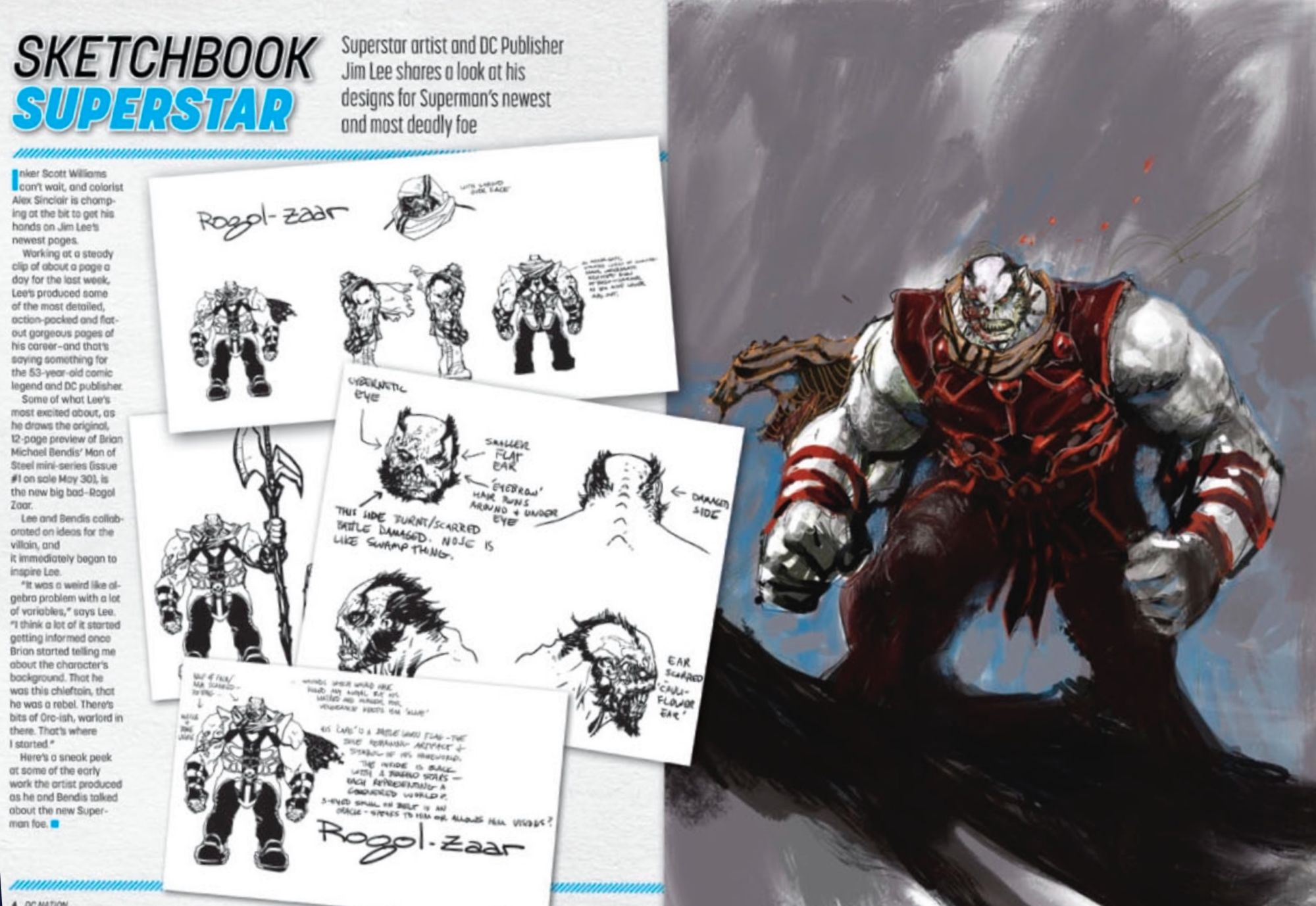 In the back of DC Nation #0, out today, there is a tease for DC Nation #1, the new in-house print-and-digital magazine, we get a sneak peek at Jim Lee's original designs for Rogol-Zaar, the new Big Bad for Brian Bendis' upcoming run on Superman, next appearing in the upcoming Man Of Steel weekly series.