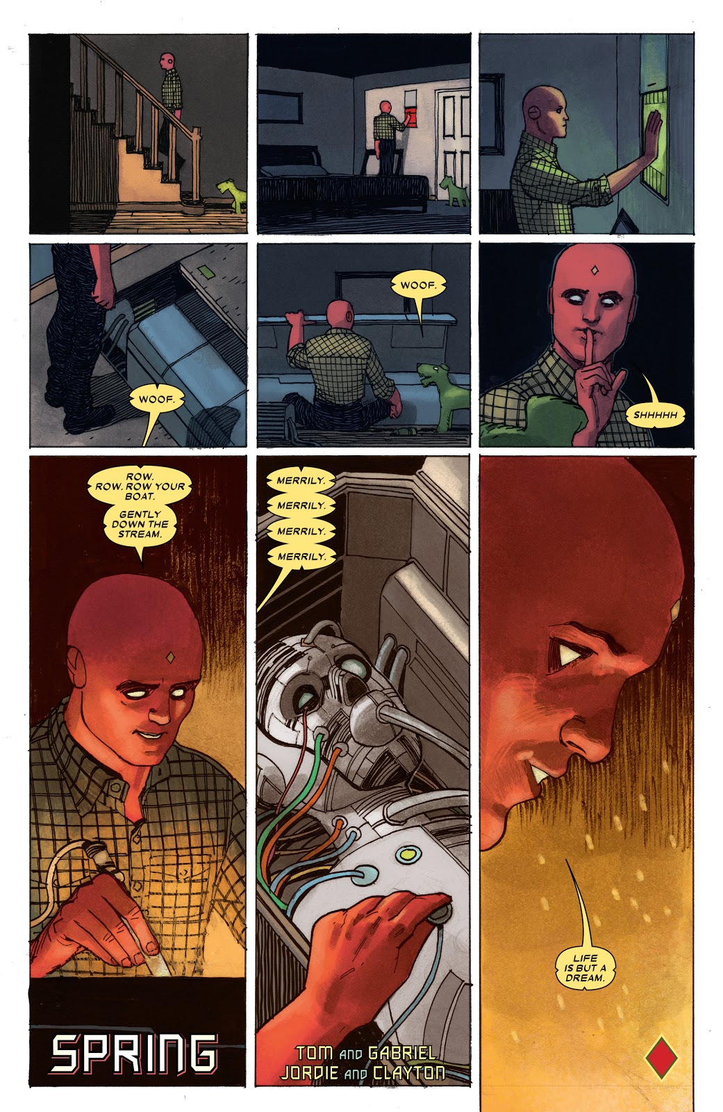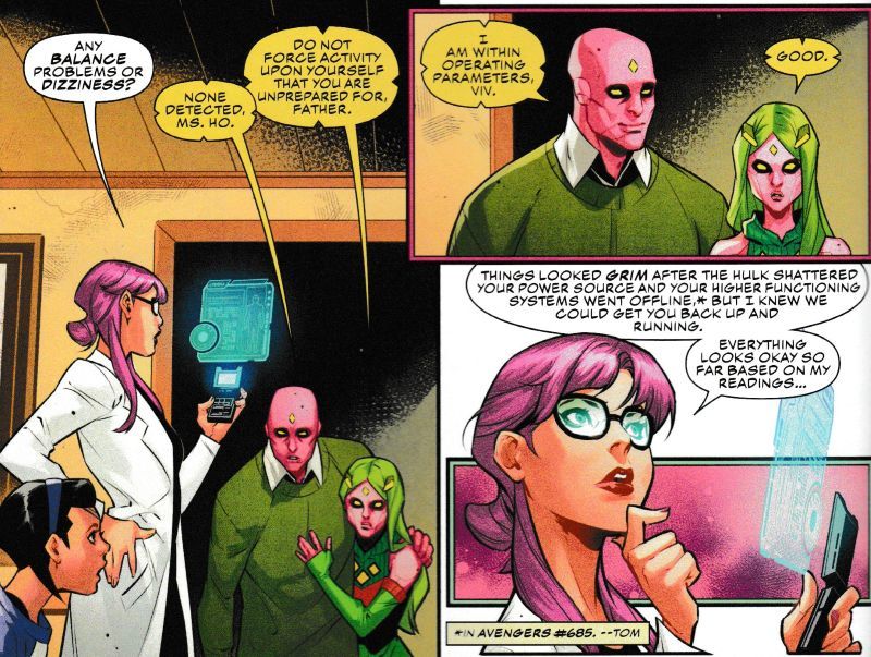 Well, today Jim Zubkavich, Kevin Libranda, and Marcio Menyz appear to be using The Champions series, which stars the Vision's daughter Viv Vision, to tell a sequel. Visiting The Vision's family home, as seen in that series, including his dog Sparky. And getting a general health check…