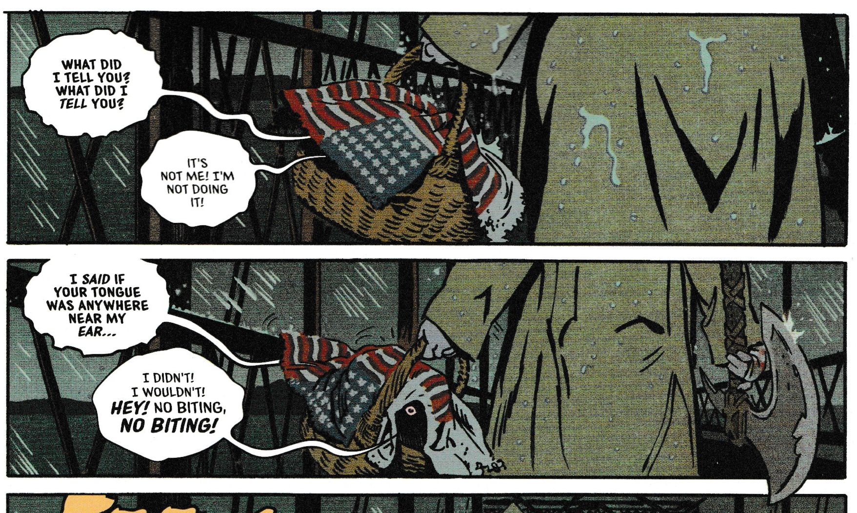 The rain lashes the grassy dunes of Brody Island, and seagulls scream above the bay. A slender figure in a raincoat carries a large wicker basket, which looks like it might be full of melons… covered by a bloodstained scrap of the American flag.