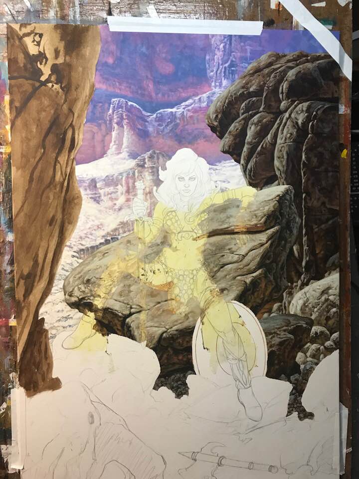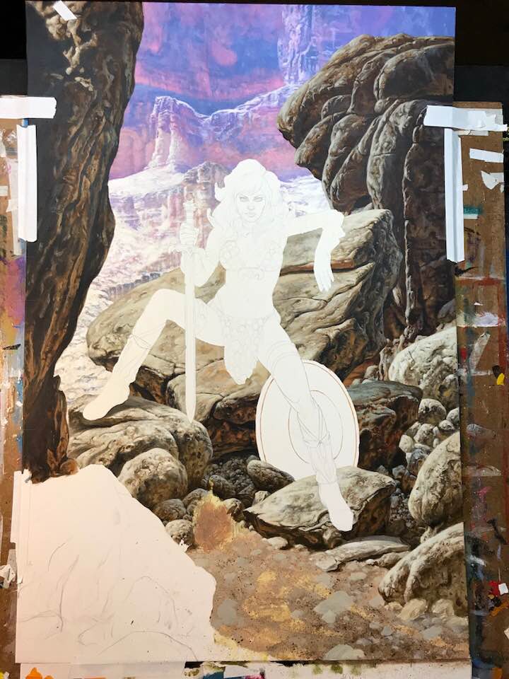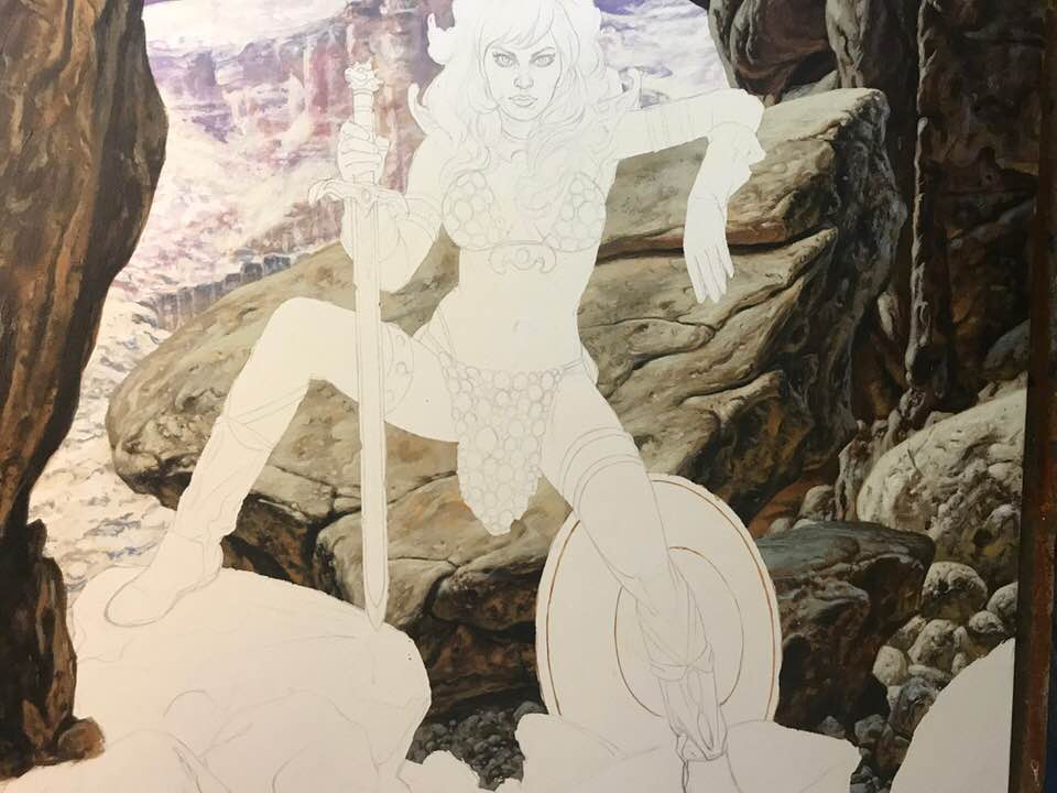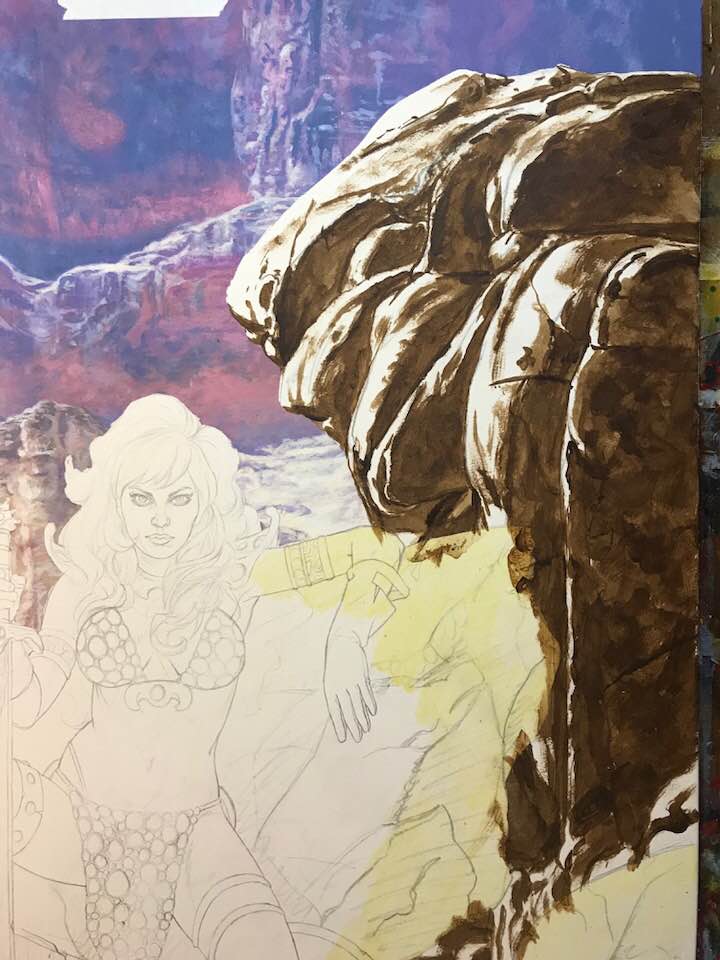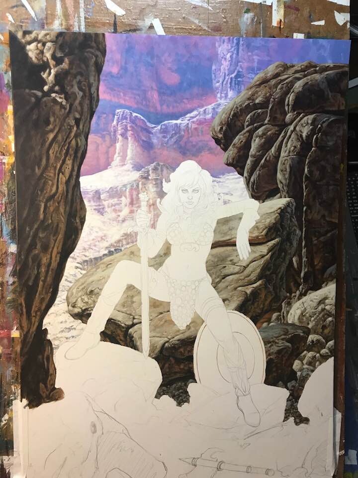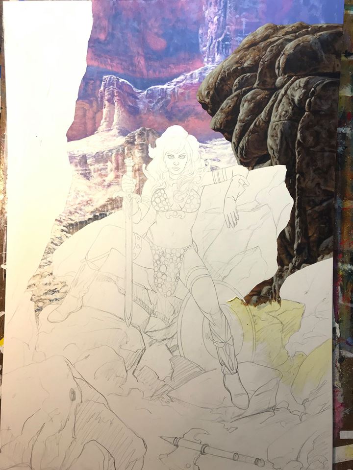 Joe posted the sketch of the new piece and talked about how he made a chance just before he began painting. A change that would mean more work for him, but also add a lot of depth to the piece. He decided instead of open sky behind Red Sonja, he would put in a mountain range and you can't argue from the end result that this was a brilliant idea.