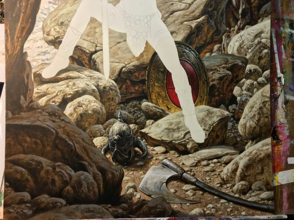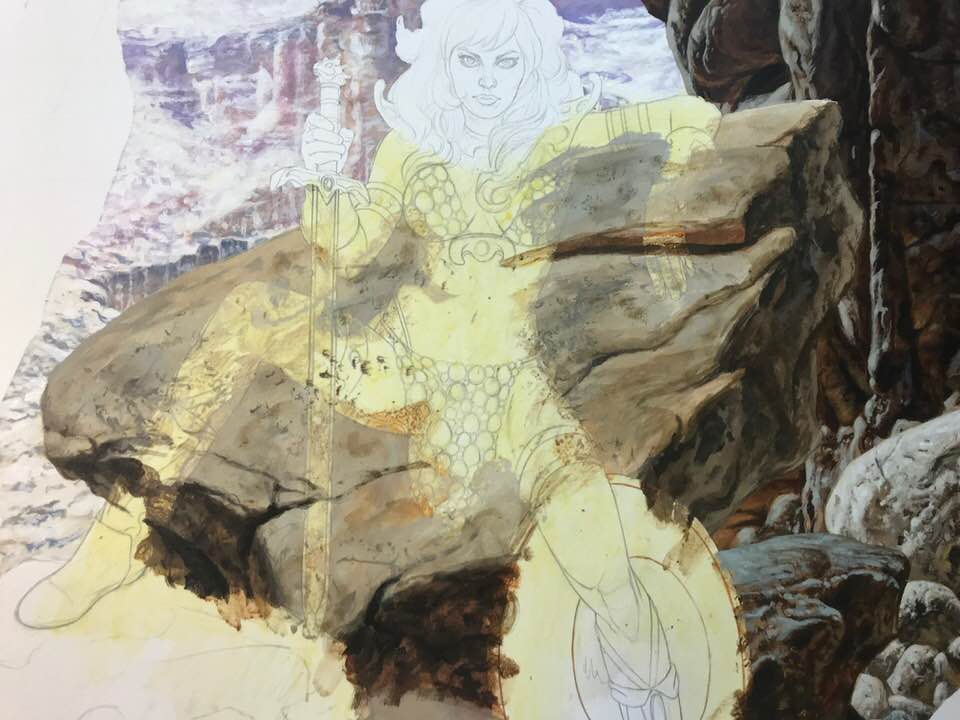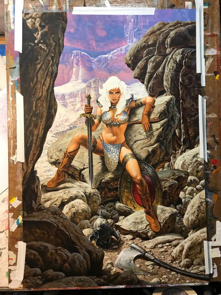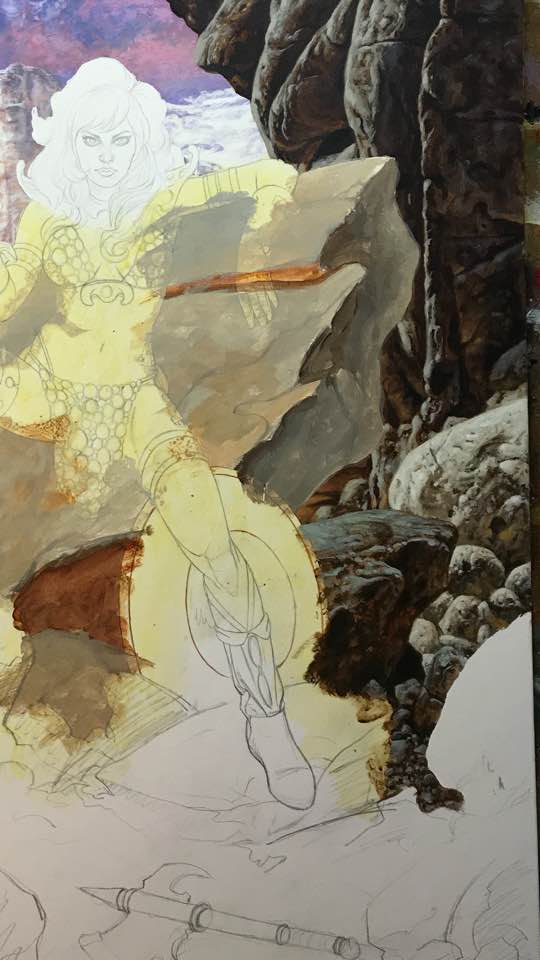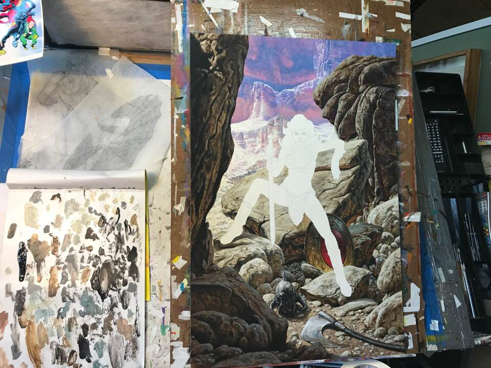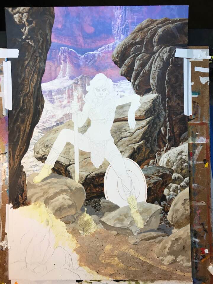 Joe posted the sketch of the new piece and talked about how he made a chance just before he began painting. A change that would mean more work for him, but also add a lot of depth to the piece. He decided instead of open sky behind Red Sonja, he would put in a mountain range and you can't argue from the end result that this was a brilliant idea.