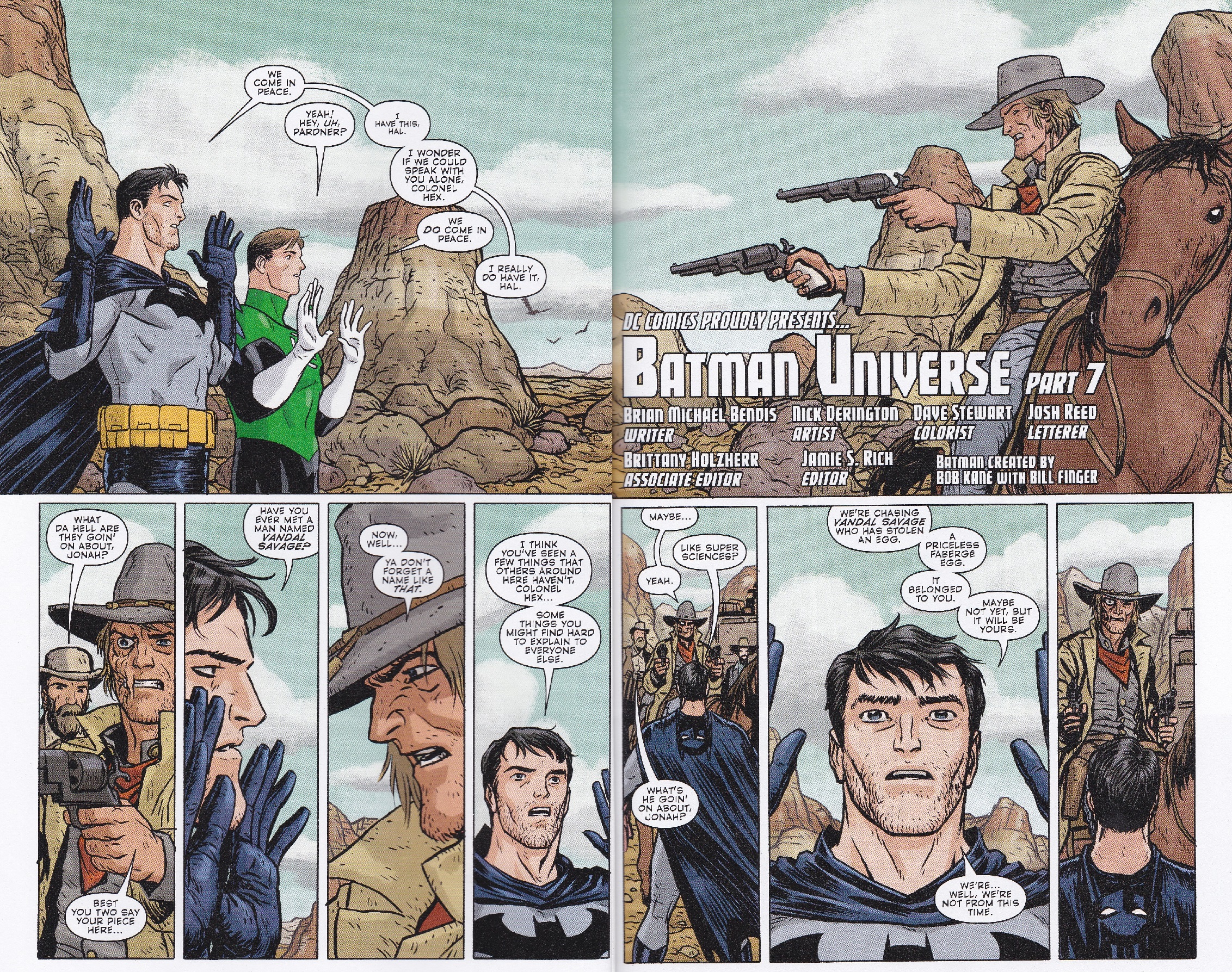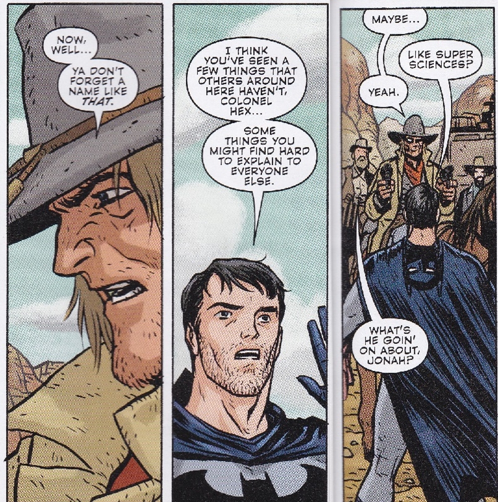 "In case you didn't know, Jonah never achieved higher than the rank of lieutenant during his time in the Confederate cavalry, so I figured either A: Batman doesn't understand military ranking, B: Jonah's timeline had gotten royally messed up and no one told me, or C: both Bendis and the editors did zero research on Jonah Hex before writing this story. Then I considered option D: Batman was calling him Colonel not as a rank, but out of respect."
