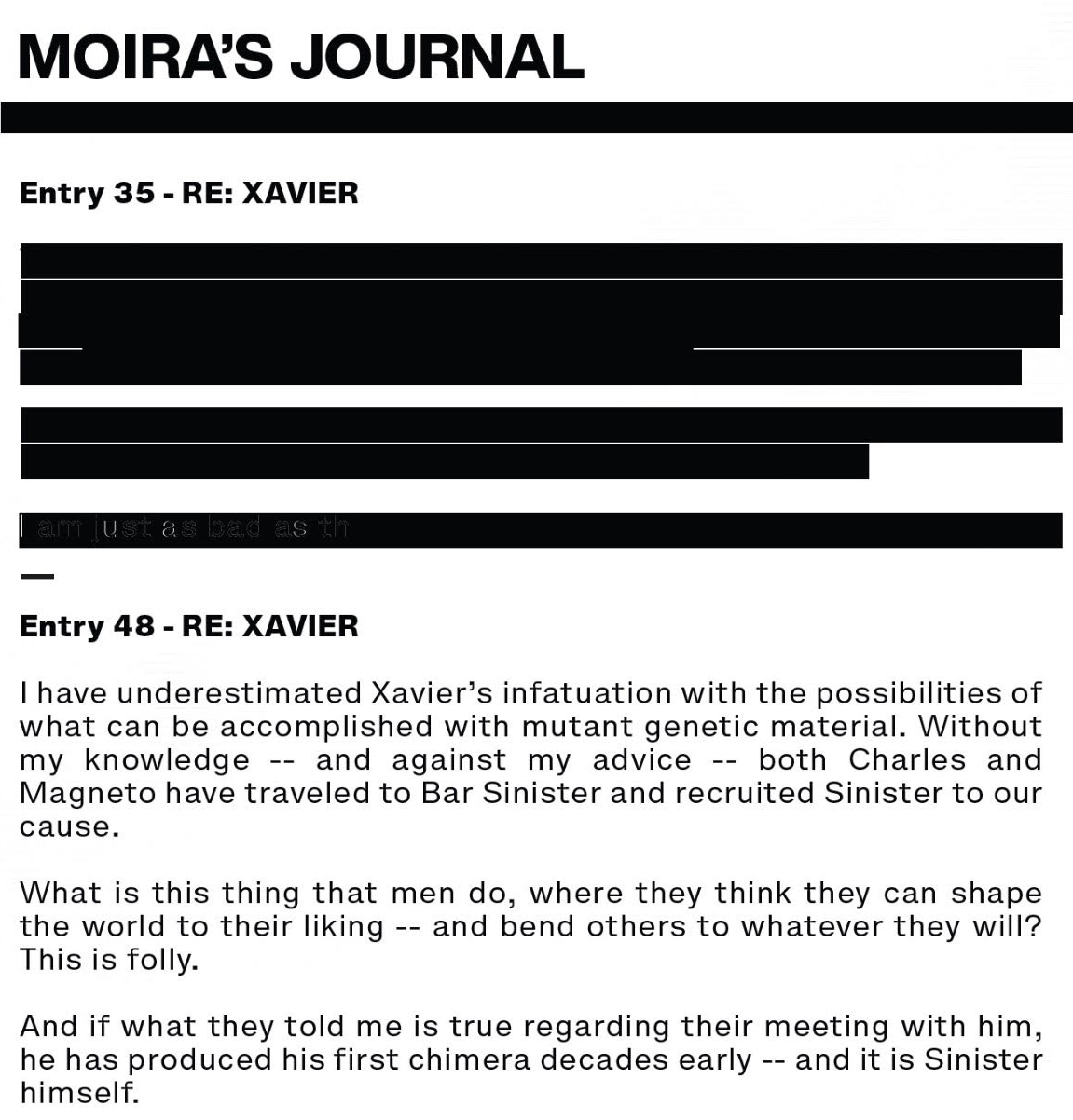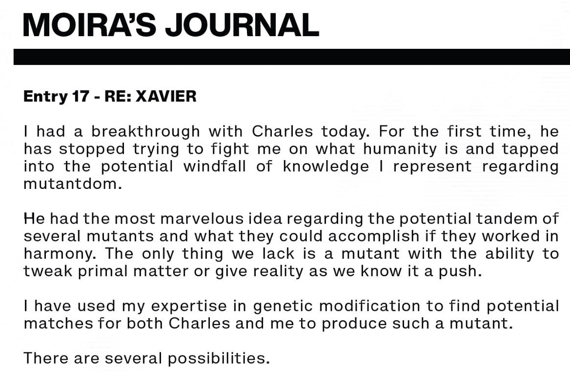Potential matches. Moira McTaggart's son was Proteus. Professor Xavier's son was Legion. Were they both trying to create such a mutant that would be able to alter reality and keep bringing the mutant race back from the dead as we saw previously? Who might have been able to help with such genetic involvement? Oh and still with the redactions.
