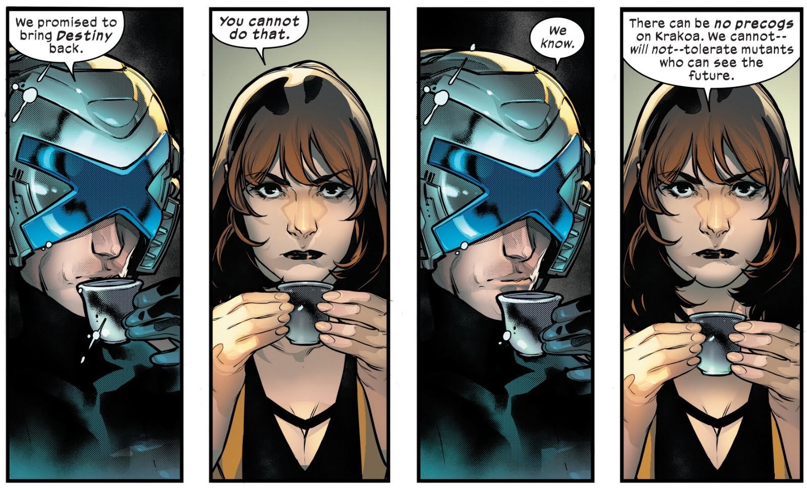 In Powers Of X we have been observing four separate timezones. X0, around the time that Professor Xavier decides to create what would become the X-Men. X1, the present day with Krakoa established as a new base for mutant kind. X2 as a dystopian hundred years in the future, revealed as Moira's past life, her ninth life, as she had been preserved to keep the timeline in existence. And killed by Wolverine to restart the timeline again.