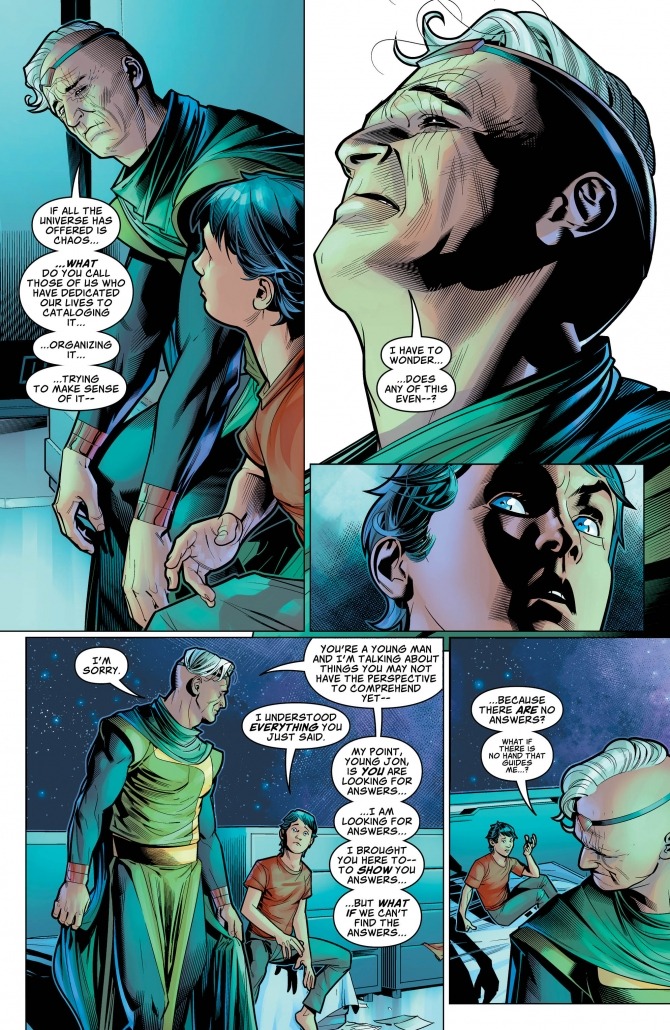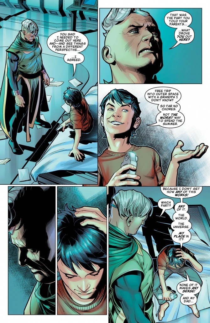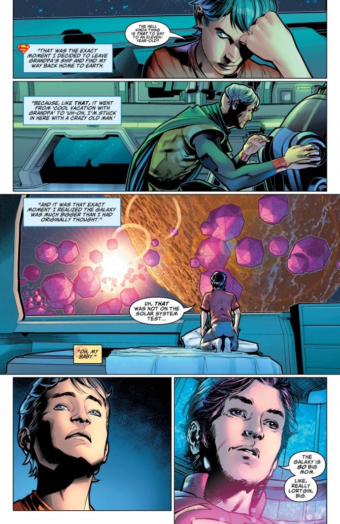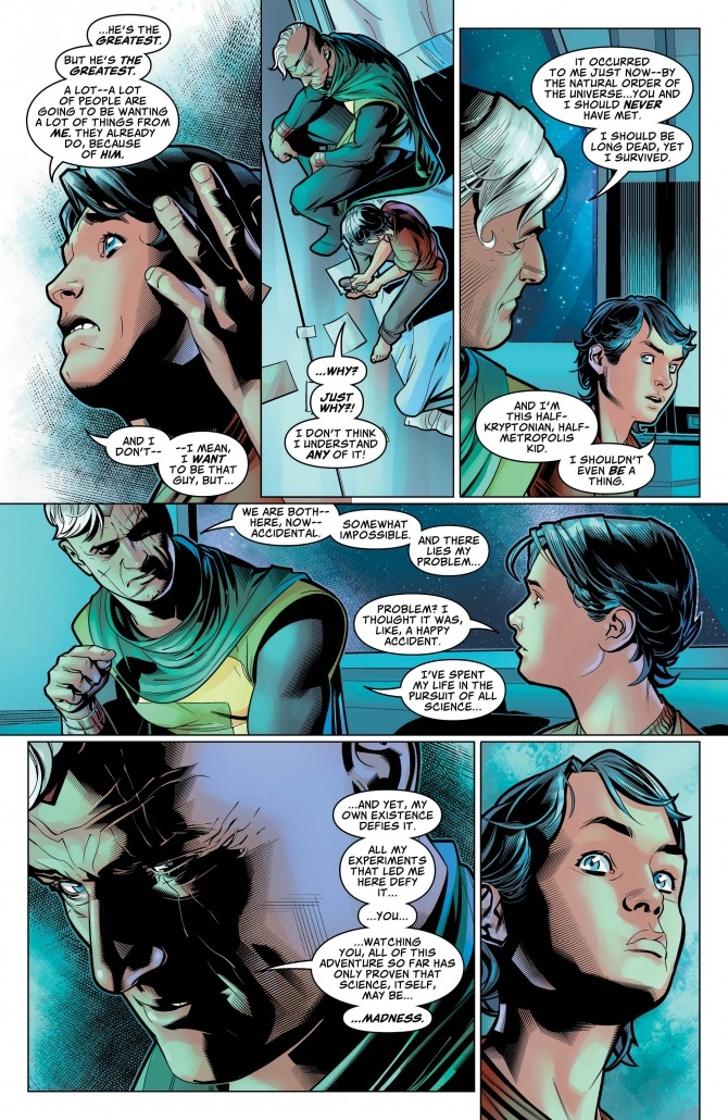 In tomorrow's Superman #8, we see more of what young Jon Kent was up to for all those years traveling space with his grandpa. In the previous issue, we learned that Jon thought Jor-El had gone insane, and in this preview of tomorrow's issue, we learn why: because he's questioning his faith in science.
