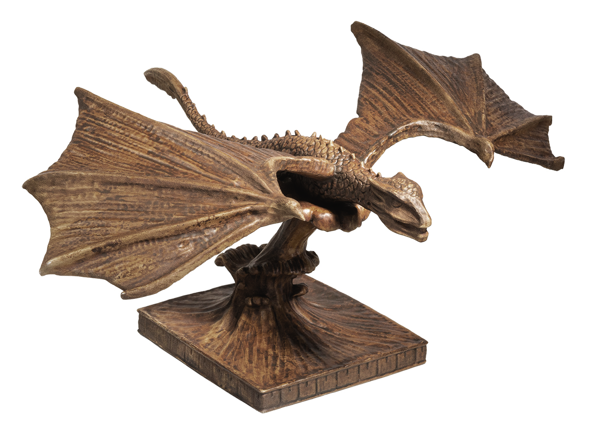 The Targaryen Map Marker was seen in Season 7 in Dragonstone Castle on the map table where Daenerys Targaryen and company plot their plan to conquer Westeros. This limited edition polyresin prop map marker replica representing Daenerys and her dragons is made to look as if it is carved wood. Measures 5" high, with a 12" wingspan, and 8.5" from head to tail. Packaged in polyfoam in a full-color box.