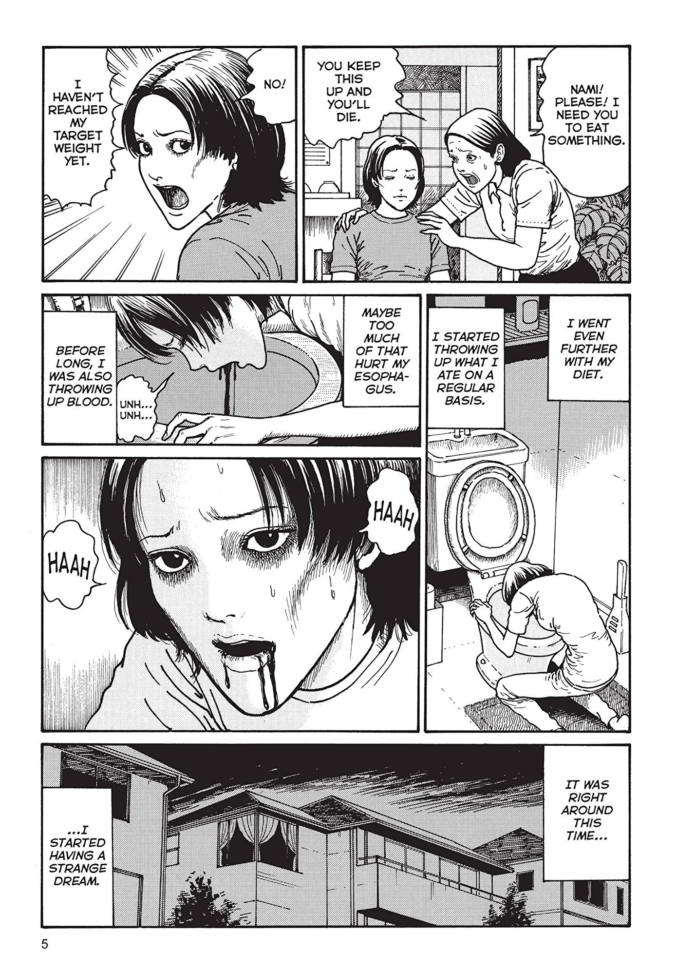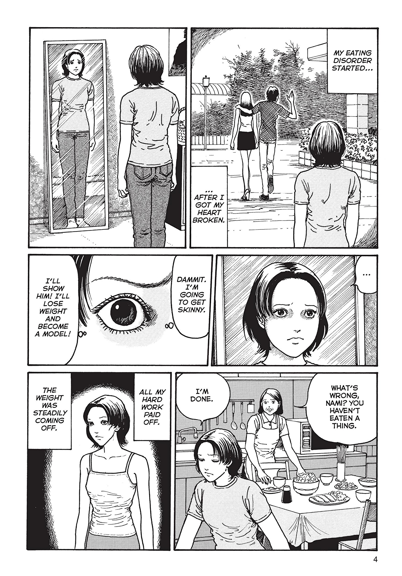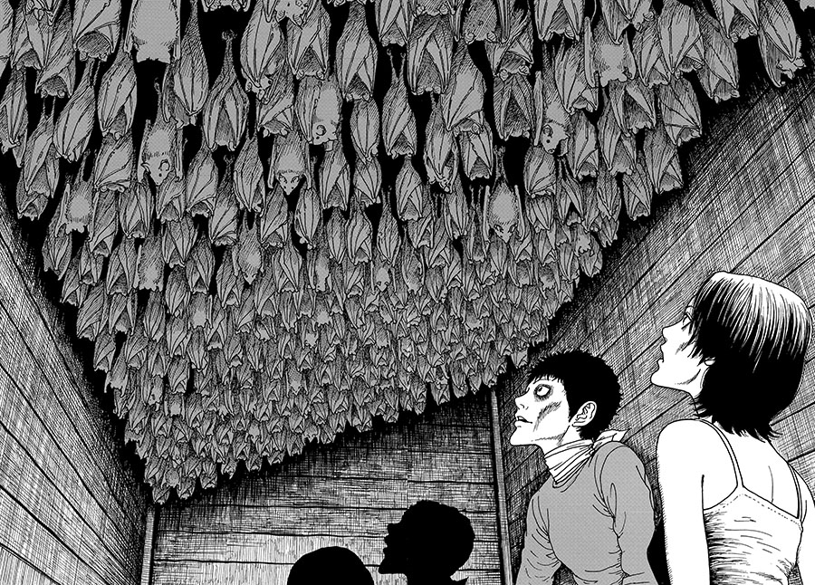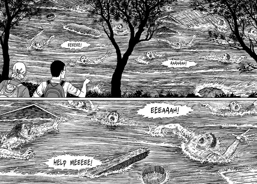 Smashed consists of thirteen stories, some longer than others with titles like "Bloodsucking Darkness", "Death Row Doorbell" and "I Don't Want to be a Ghost", which show Ito is not messing around. A high school girl who wants to lose weight wakes up every morning with tiny bite marks all over her body and finds herself losing weight and blood… An unfunny comedy act by two creepy women causes their audiences to die laughing… A pair of hikers discover a town plagued by a phantom flood with endless victims… A mysterious syndrome locks heartbroken people into poses that turns them into living statues… and these are the least gross and creepy of the stories. They get even more clammy and claustrophobic as the collection goes along.