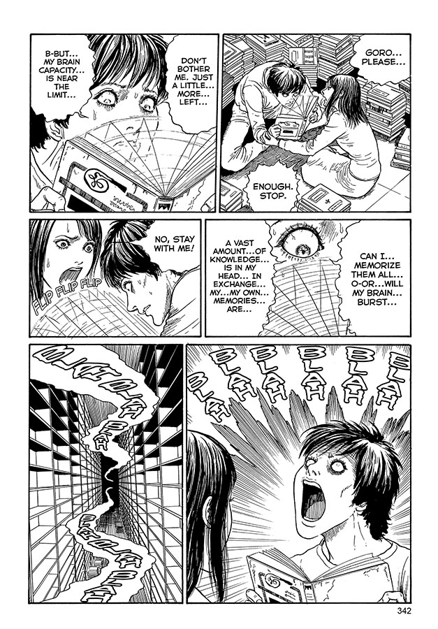 It's weird to review Junji Ito horror stories. To just describe one is to spoil it since its entire premise is its reason for being. These are short, sharp bursts of shock and horror like a good episode of Twilight Zone, only there are no morals to be learned, only a Lovecraftian attitude of being at the mercy of a cruel universe that's out to get you when you show the least hint of vulnerability. Ito's universe is not indifferent to you. It actively wants to mess with you and mutilate you. It laughs at your cries of pain and pleas for mercy. It can reach out at you randomly, or Nature notices what your fears and anxieties are and exploits them specifically to come at you. This indicates that Ito's universe isn't godless. There is a god and this god is a sadistic psychopath. Sometimes I feel like Ito is either as freaked out as his protagonists, thinking of the most terrifying images and ideas to challenge himself, or just coming up with the most shocking thing he can to shock and horrify the reader. It's that conviction that makes his stories work.