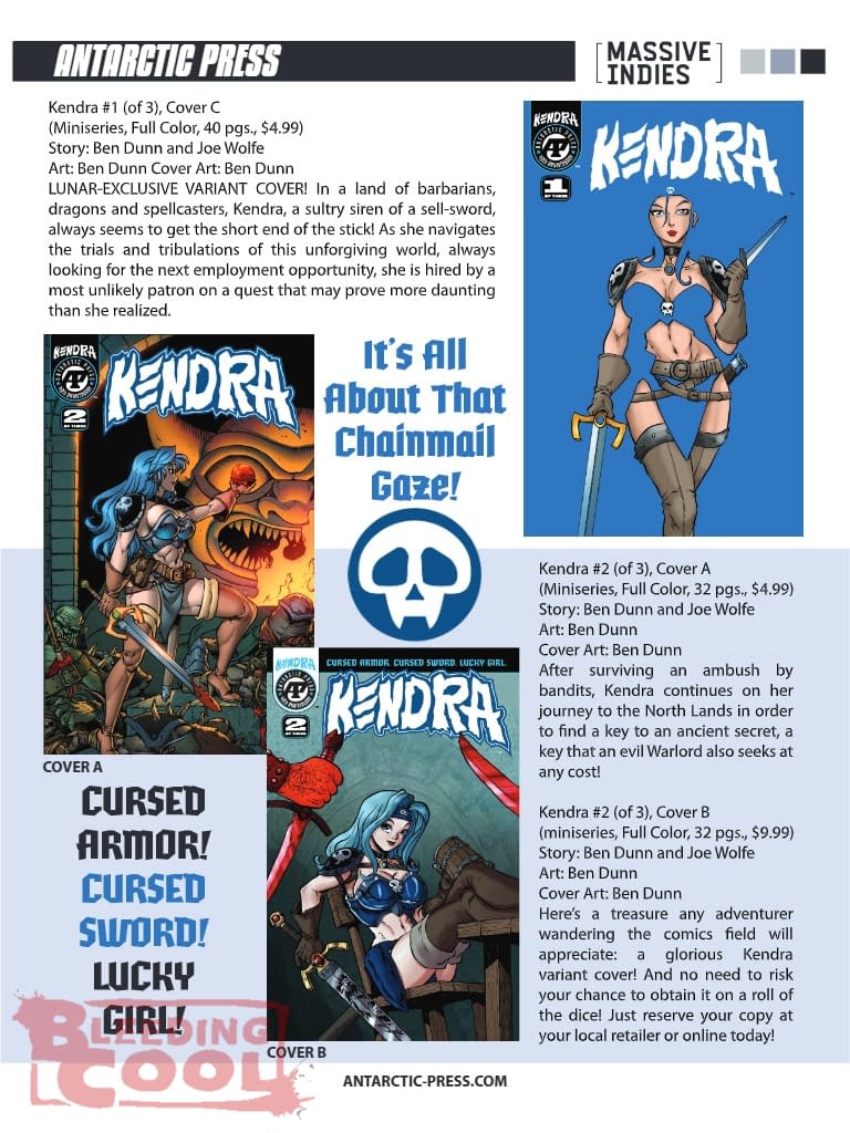 Antarctic Press November 2025 solicits and solicitations launch Kendra by Ben Dunn and Joe Wolfe, and originally known as Blue Sonja until lawyers got involved, through Lunar solicitations courtesy of Massive Indies for the first time and so have gotten a negative space cover for Kendra #1.