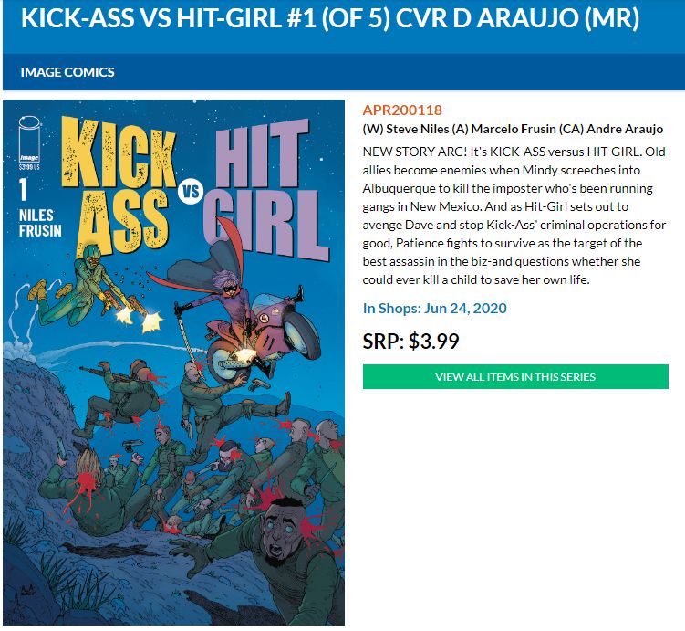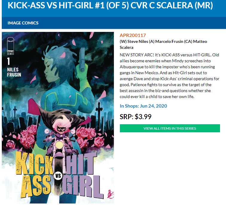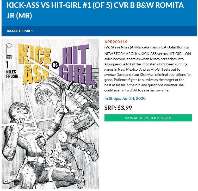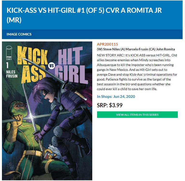 Image Comics/Millarworld have been publishing a number of Kick-Ass and Hit-Girl series on late, based on Mark Millar and John Romita 's Marvel comic book, adapted into to movies and just waiting for the rights to revert to Netflix so that Mark Millar can start writing them again. But in June, under a John Romita cover, the two series are coming together as Kick-Ass Vs Hit-Girl… the new Kick-Ass, that is. From Steve Niles and Marcelo Frusin. From Previewsworld…