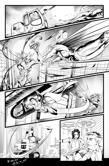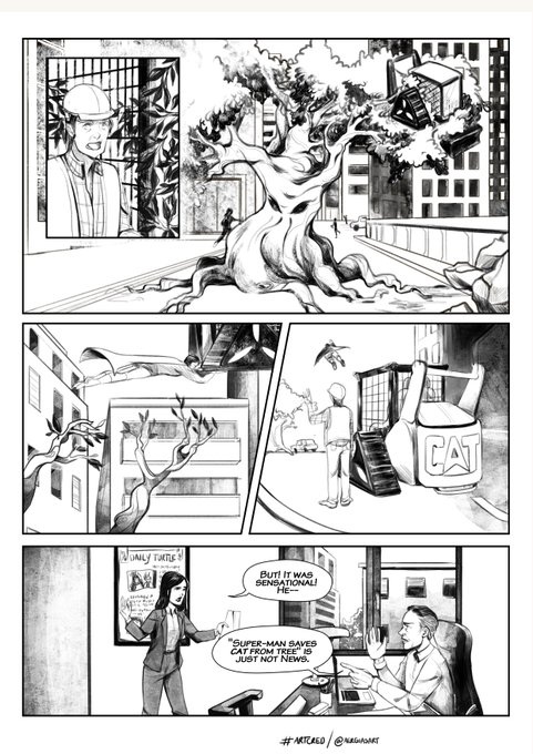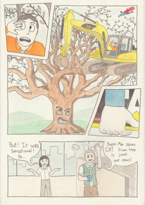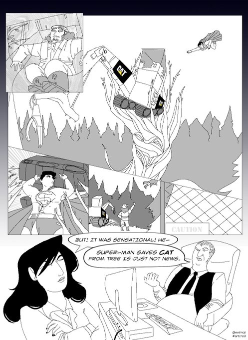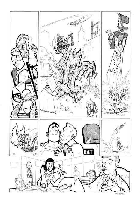(If you want, it's possible that you could frame panel 1.3 so we have the branding prominently enough in it. If so, you could lose this panel and regain space on the rest of the page. As long as it's clear it's a CAT digger, that's fine.)