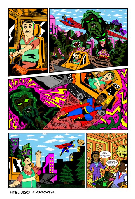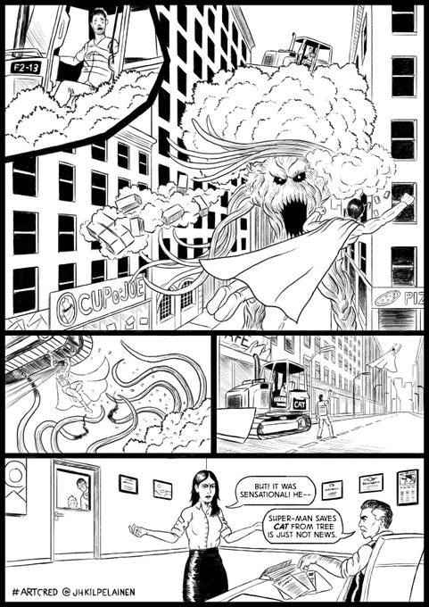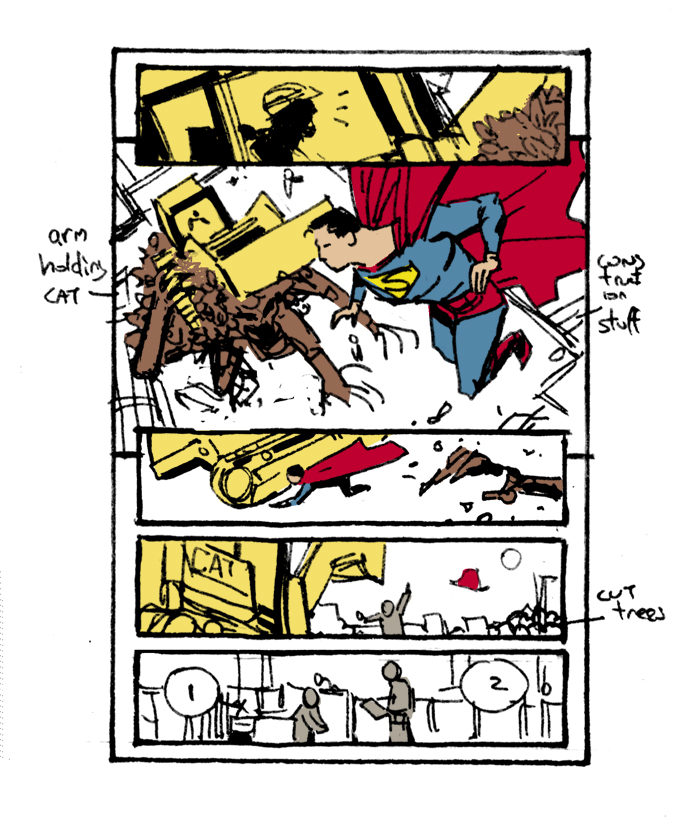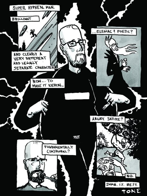Anyway! This is one page, five panels. I was playing with a few other rough ideas, some striking an elegiac poetic mood, some speaking to the fundamental morality of the character, and some just being really angry satire… but I figured that dumb is best. This is quite dumb, but hopefully includes a few fun things to play with, and should work with a different effect in many different styles. Which, I guess, is the point, right?I tend to write heavy, but in this case I'm going to write a little looser. I always say that I'm very pro seeing your interpretation of the script rather than any attempt at holy writ…. and in this case, that's obviously doubly true. Add panels, details, whatever. Do what you do. Can't wait to see it.
