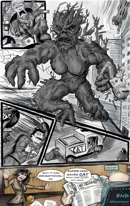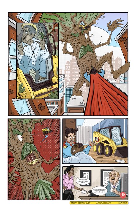 1.2 And we pull out, revealing the situation. The digger and driver are resting in the top branches of an enormous animated tree. Think Treebeard from Lord of the Rings having a really bad day, rampaging through the streets of our classical super-man urban metropolis.