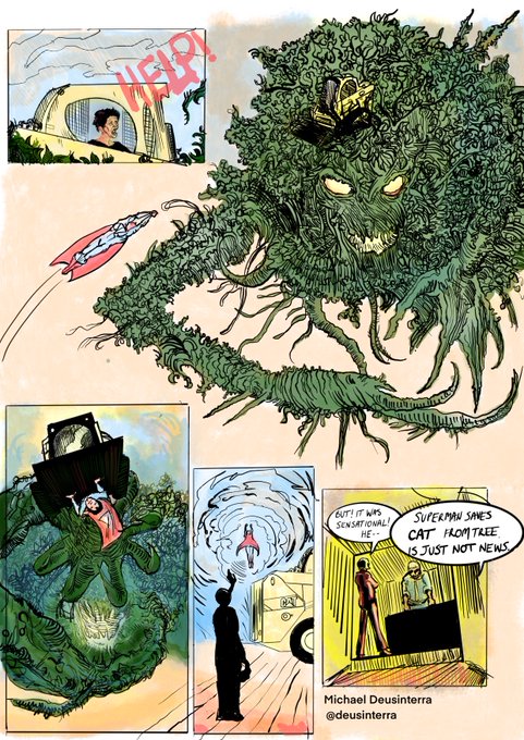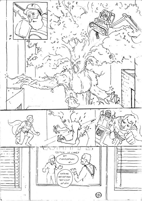 1.3 Super-man carrying the digger away from the tree, safely. The angry Tree reaching out with knotted branch fingers after them, failing to pull them from the sky.