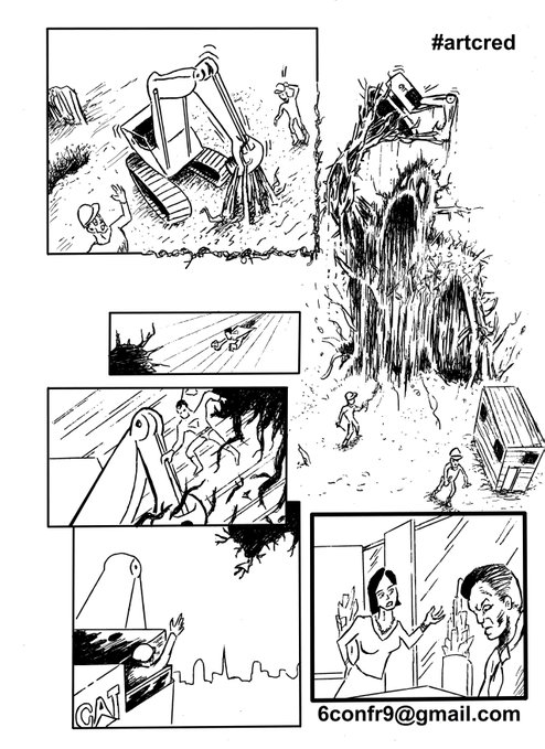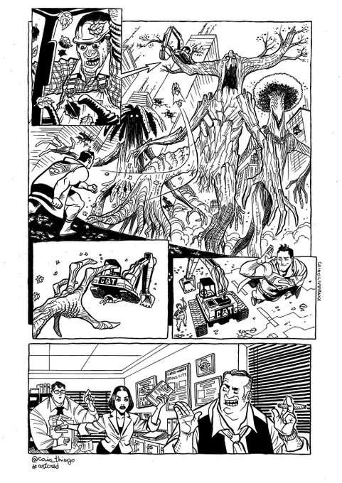 If you want the back story, I see that a construction company has basically started cutting down some trees in a forest, not knowing there's some manner of Tree people there. And now the trees are angry and on the rampage. If you want you can have other trees and saplings causing havoc, but clearly isn't essential. One big mean tree is all we need.I'd say this is the largest image on the page.