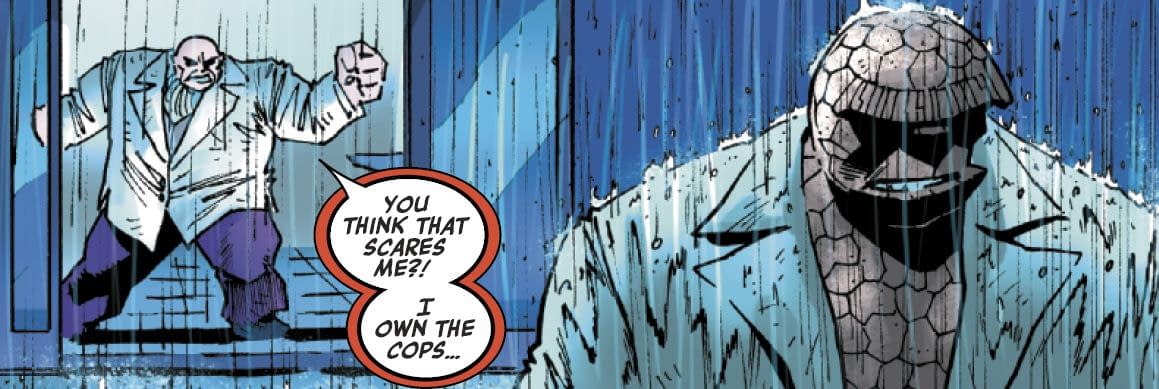 Kingpin is back in New York City. The former mayor of the city may be wanted for murder, but as he says, in The Thing #5, published today, he has some advantages in that regard.