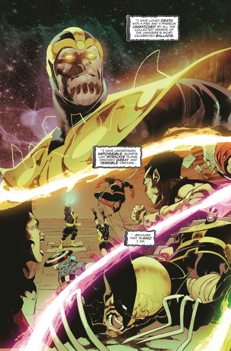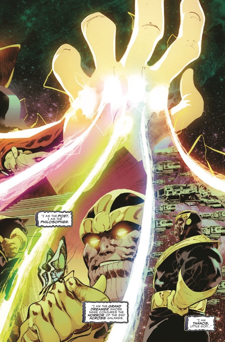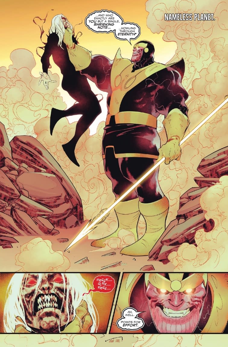 - The preview shows Thanos wielding cosmic power while philosophizing about love and death as he faces off against the King in Black