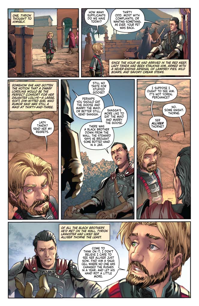 We once again showcase a scene where Tyrion sits and talks with someone. In comics, we usually avoid weighing so heavily with this sort of "talking heads" material. However, not only is it essential to the adaptation of the source material here, but it's been an interesting reminder for me that it is only the quality of writing that matters. George R. R. Martin has built a world and characters where the slow build of tension replaces traditional action. It's still a careful dance, figuring out how to balance all that text and search for things for the characters to do during their scenes.