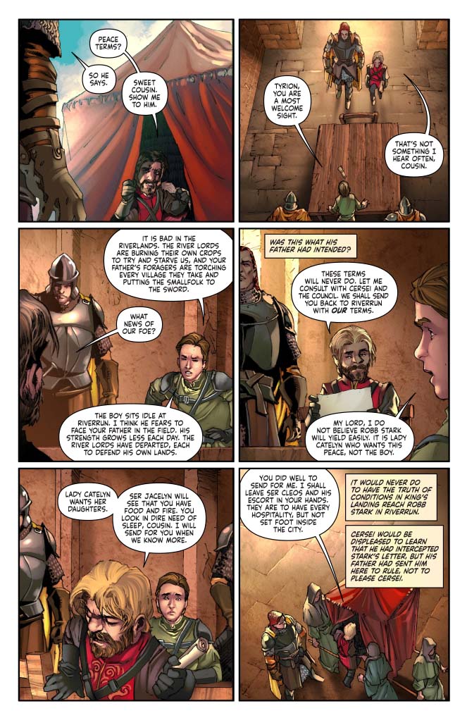 So here she is furious, filled with honest rage to protect her daughter. And she can't. And she can't even take it out on Tyrion. And so she actually breaks down, which hurts Tyrion more than he would have ever expected. That expression on Tyrion's face in panel 4 is perfect. And the lines under Cersei's eyes on panel 5 show how honest her own misery is. Art leads the writing. Read page 8 without the words. It's easy to parse. And that's important.
