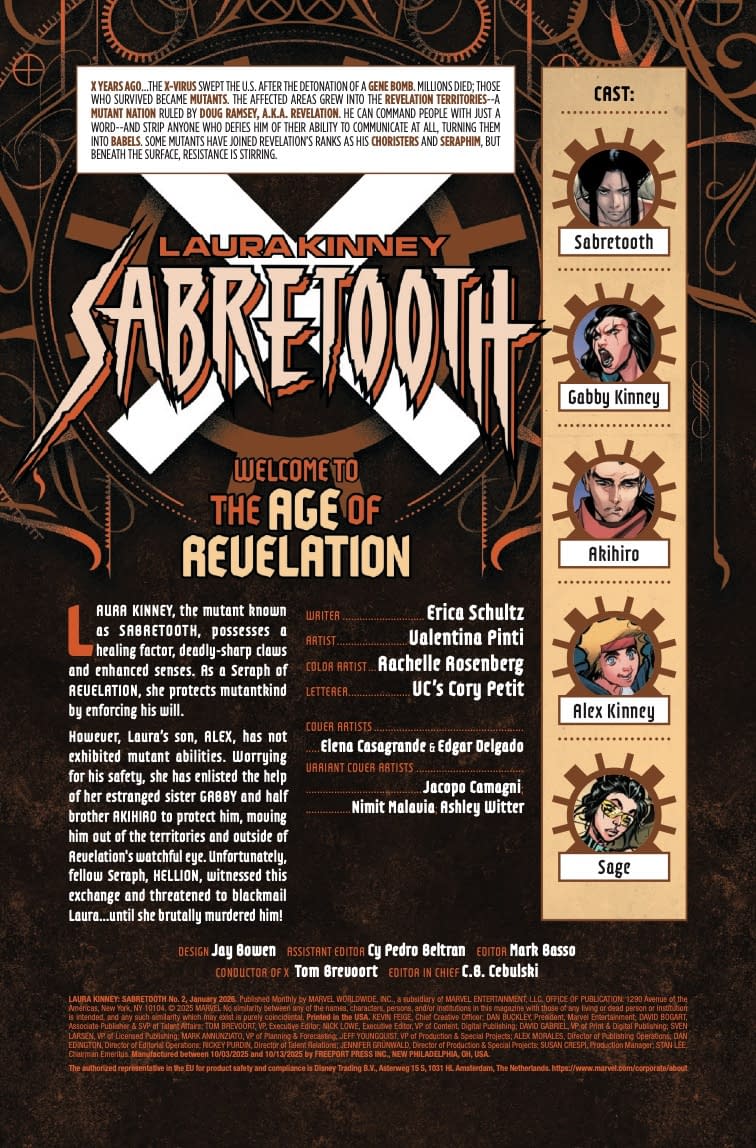 - Cover image for 75960621375700231 LAURA KINNEY: SABRETOOTH #2 JACOPO CAMAGNI VARIANT [AOR], by Erica Schultz & Valentina Pinti, in stores Wednesday, November 5, 2025 from Marvel